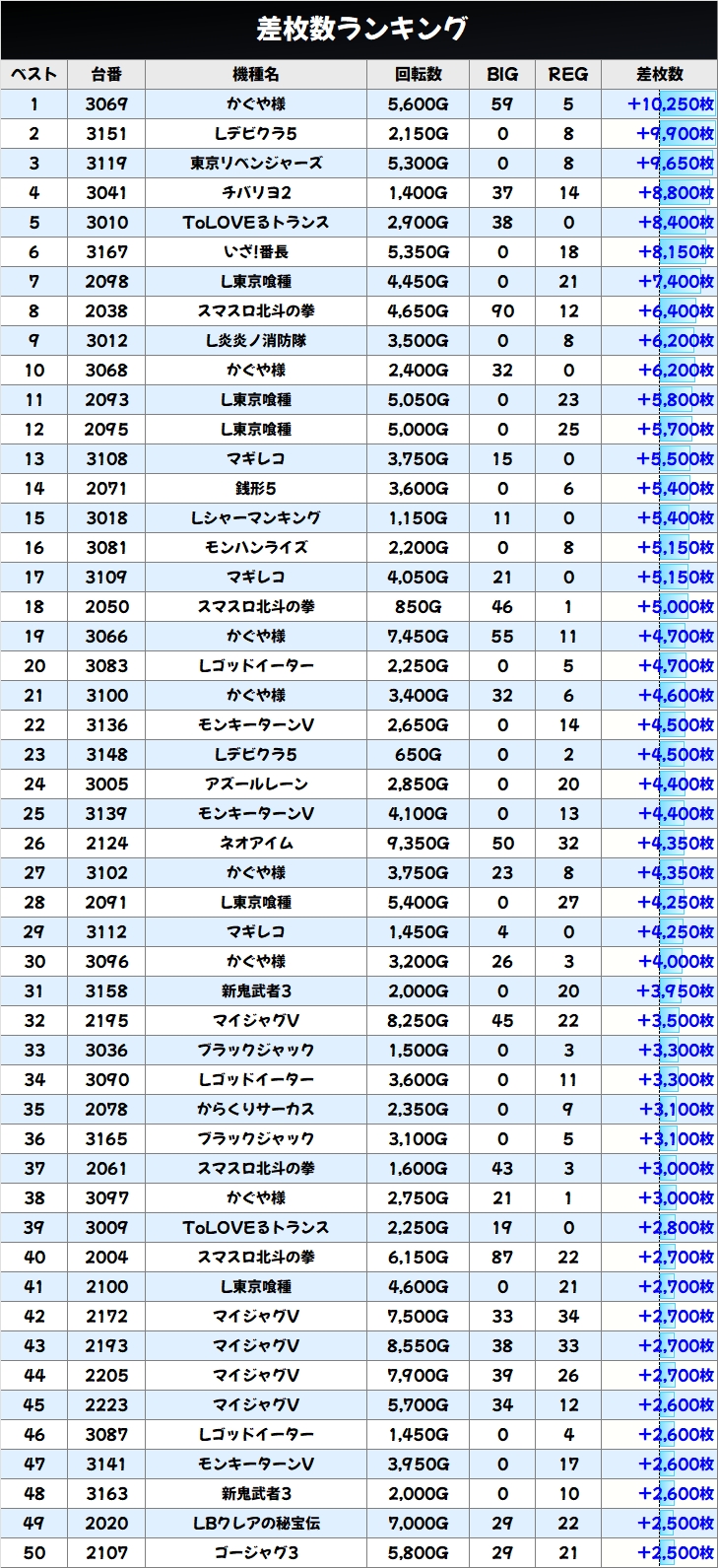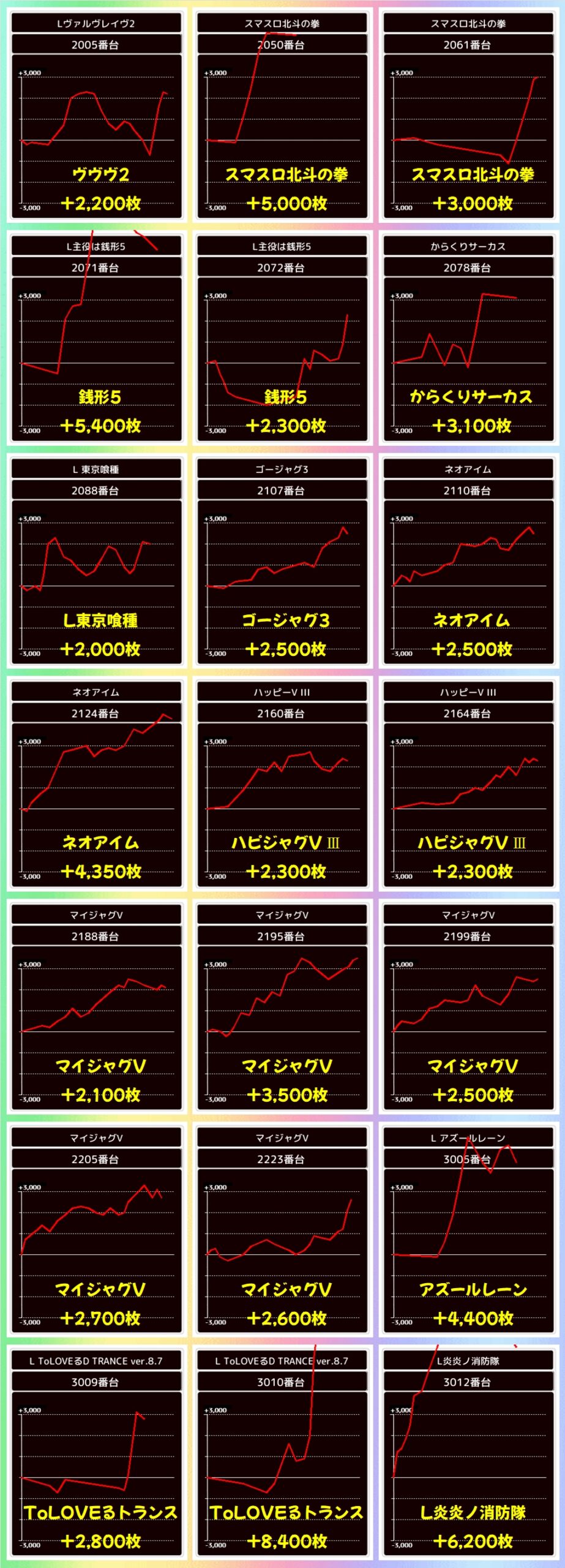 今回は掲載されている5機種のうち3機種が1/2系濃厚となっており、かぐや様からは万枚オーバー台が出現していました。