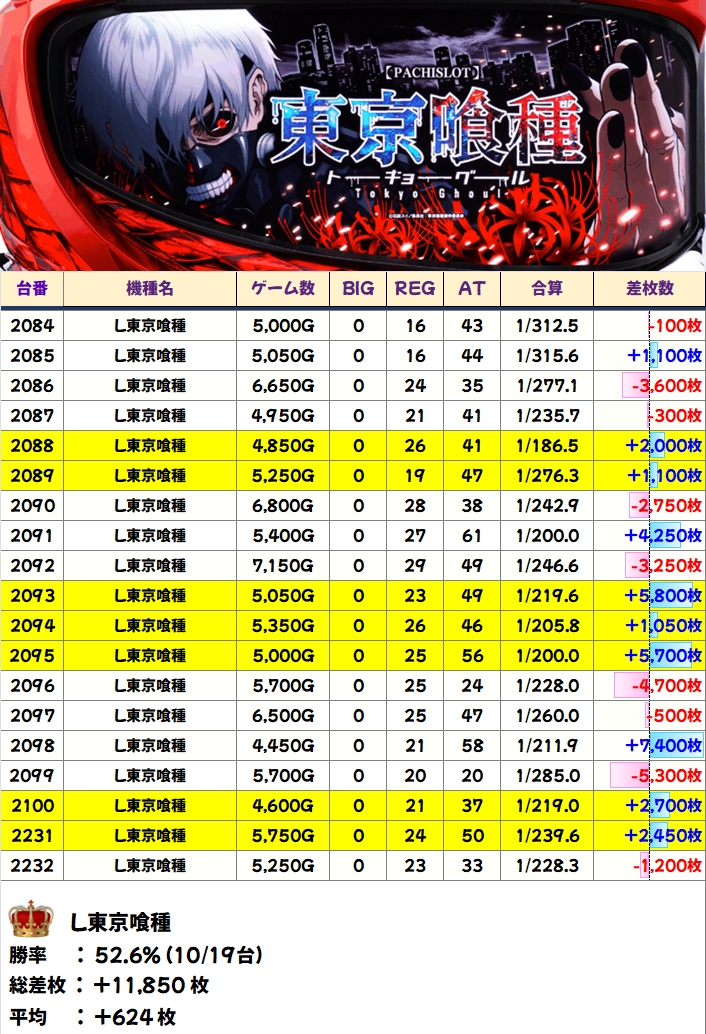 【1/2系濃厚】L東京喰種(10/19台+)→平均+624枚