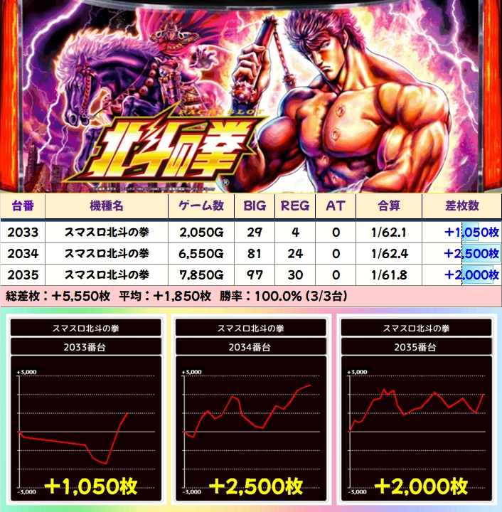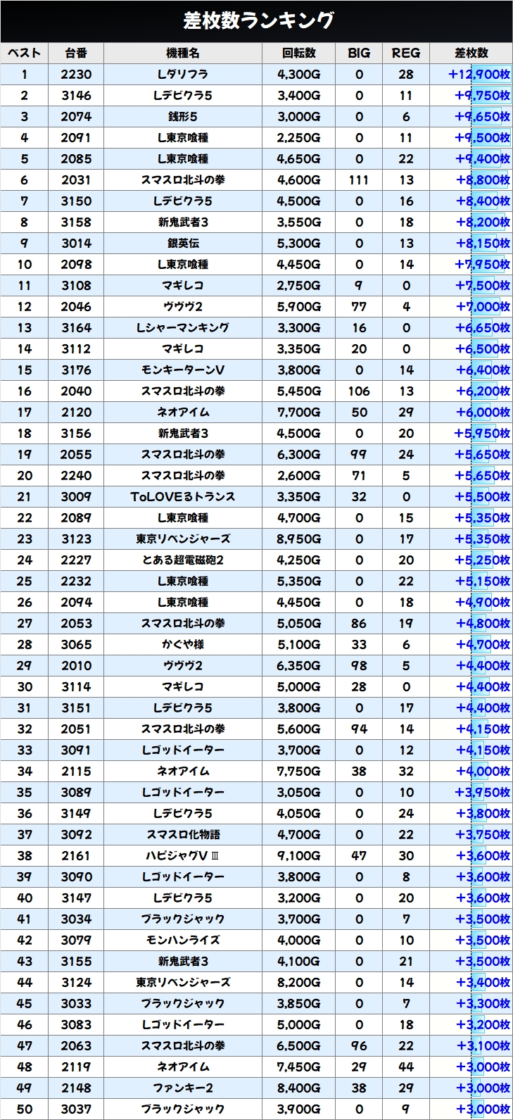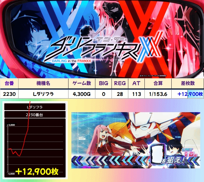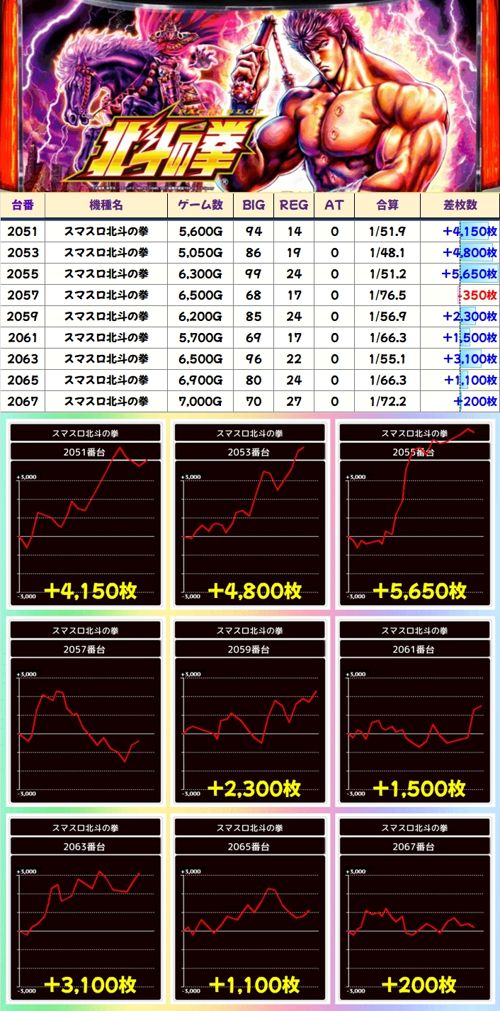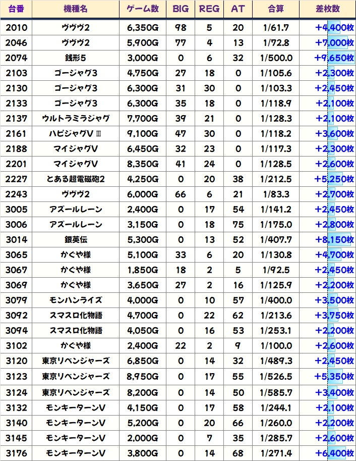 そんな今回のゾロ目の日でしたが、この日も例に漏れず大量のお宝台が用意されていたようで、ホール全体で余裕のプラス差枚を記録!