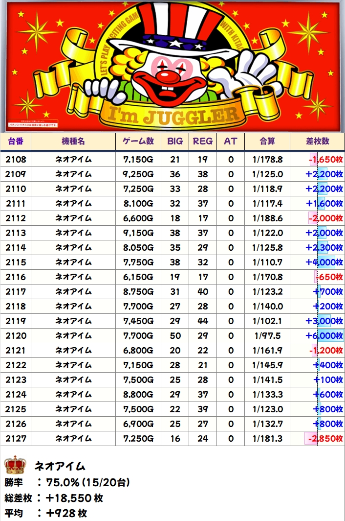 【全台系濃厚】ネオアイム(15/20台+)→平均+928枚