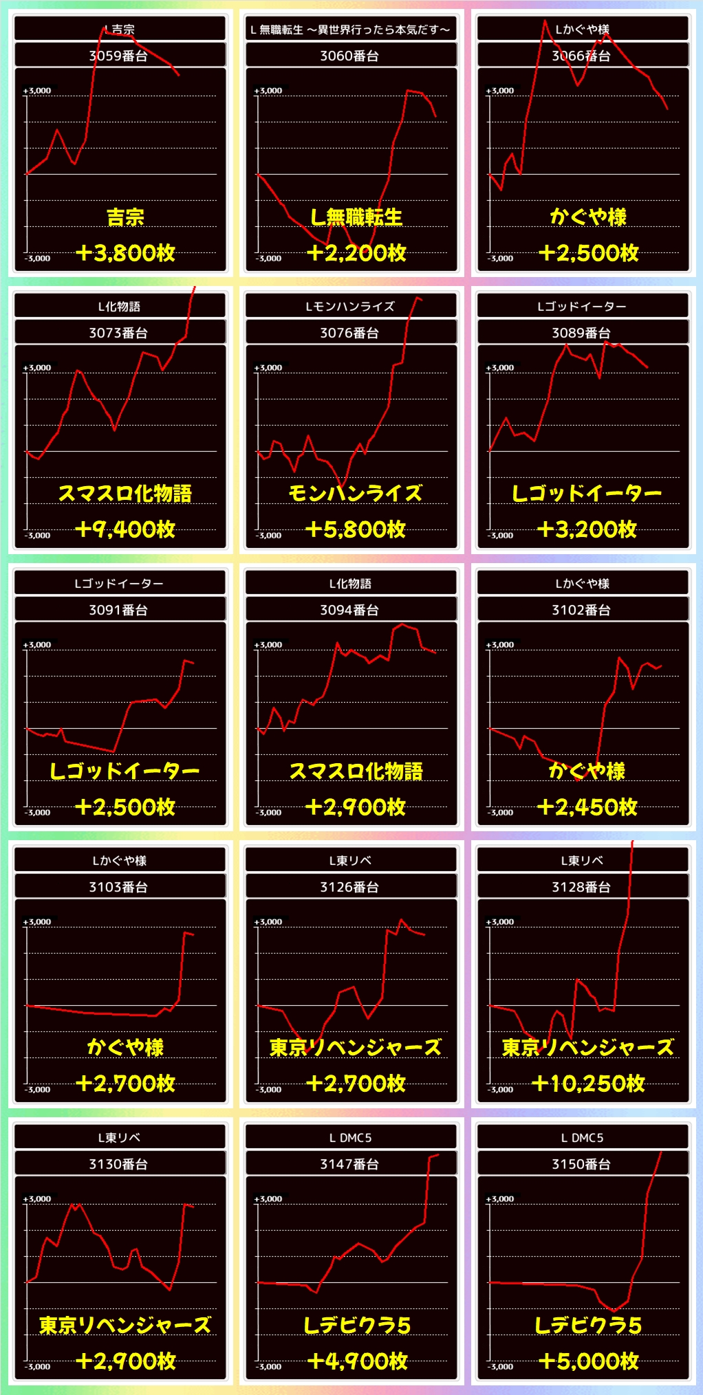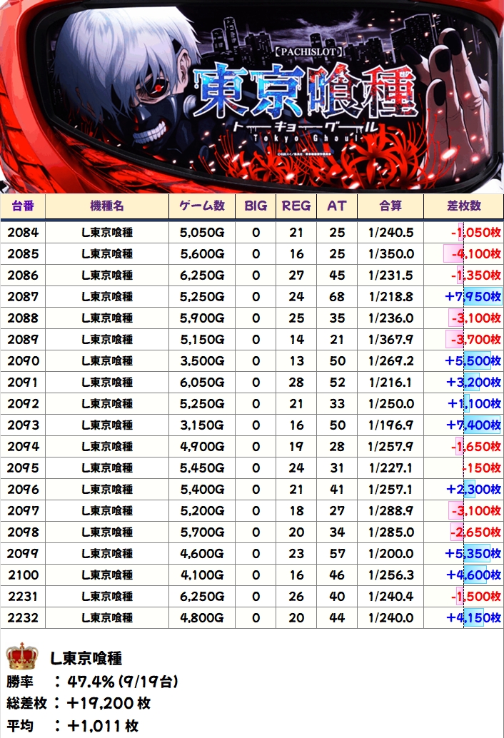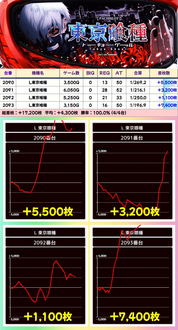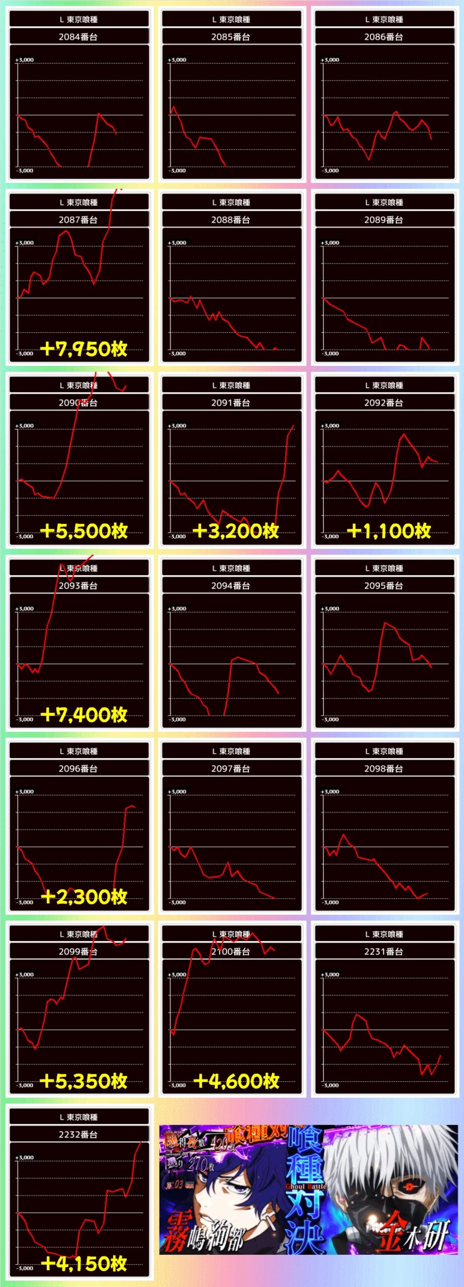 東京喰種の2090-2093番台の並びは2台並び×2箇所で4台並びとなっており、平均+4000枚以上と大幅プラスとなっていました。