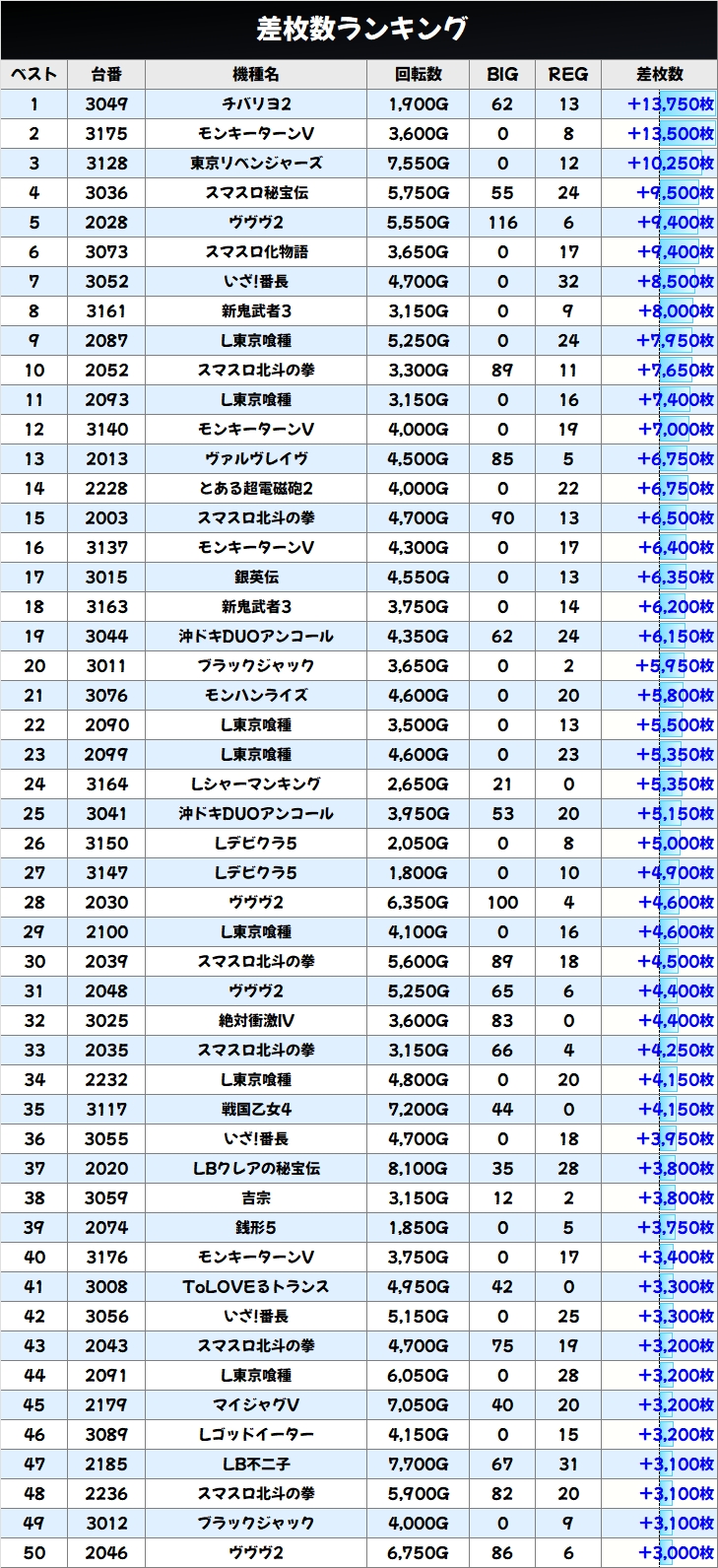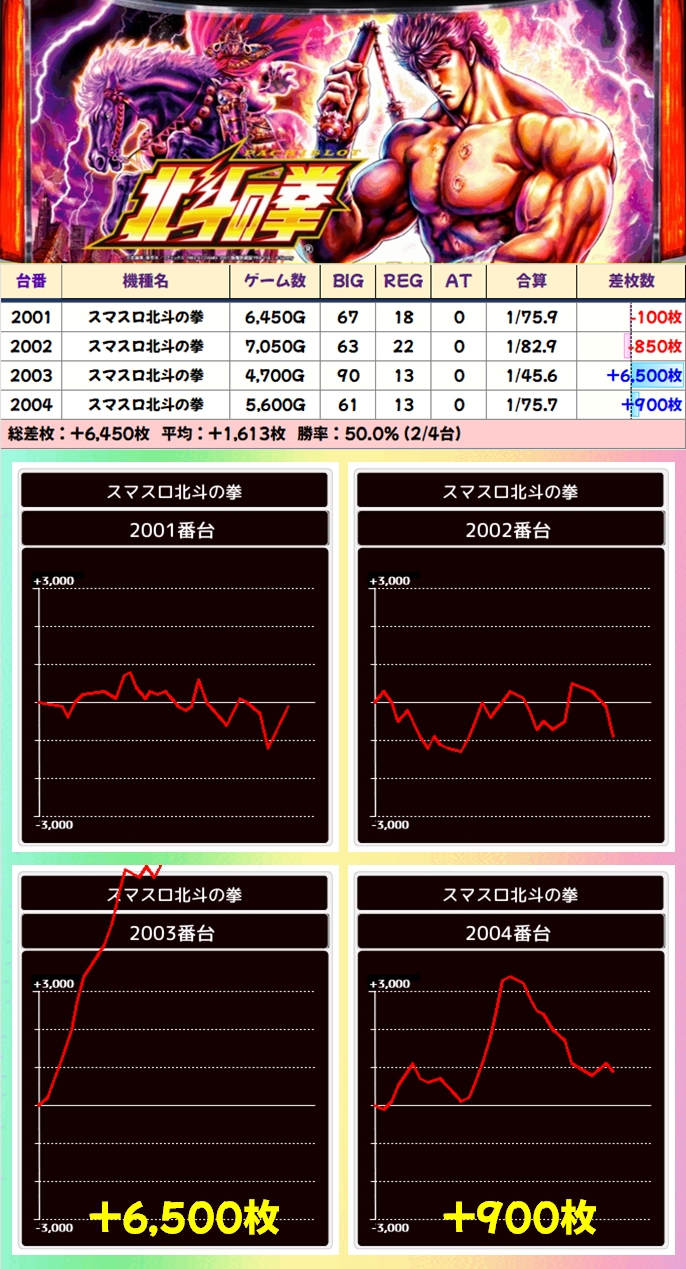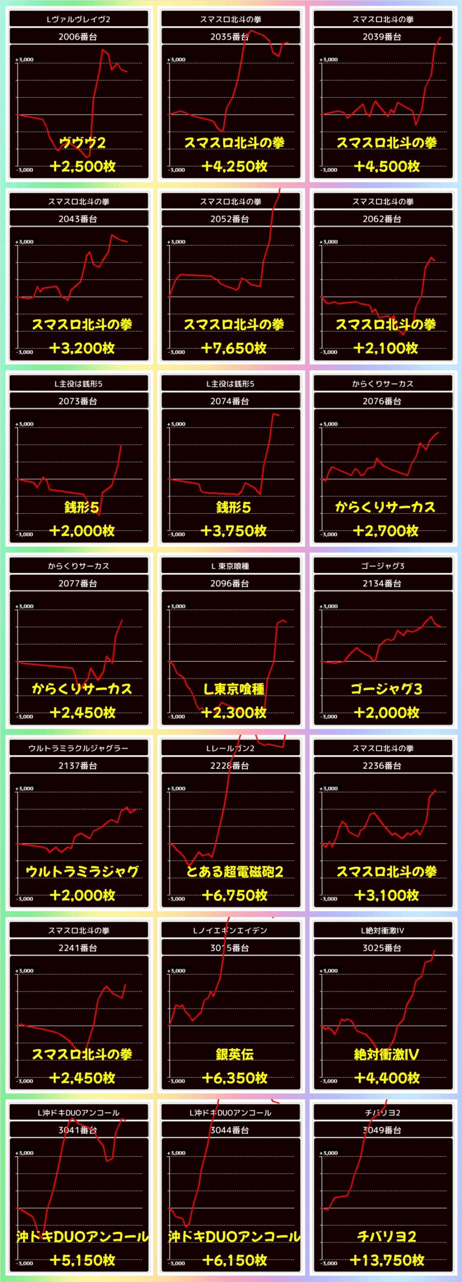 東京喰種の2090-2093番台の並びは2台並び×2箇所で4台並びとなっており、平均+4000枚以上と大幅プラスとなっていました。