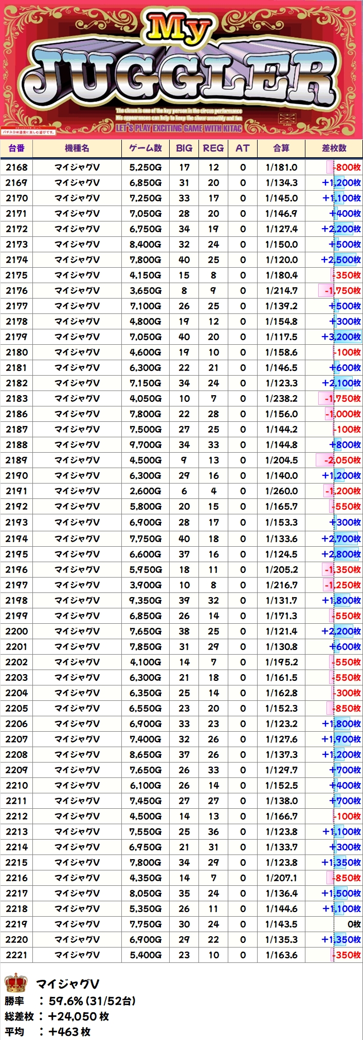 【1/2系濃厚】マイジャグV(31/52台+)→平均+463枚