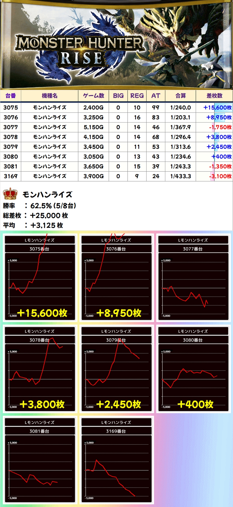 【1/2系濃厚】モンハンライズ(5/8台+)→平均+3,125枚