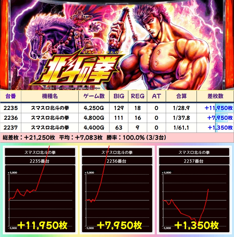 この日は北斗から並び仕掛けを確認でき、2235-2237番台の3台並びが平均+7000枚オーバーと大量出玉を記録!