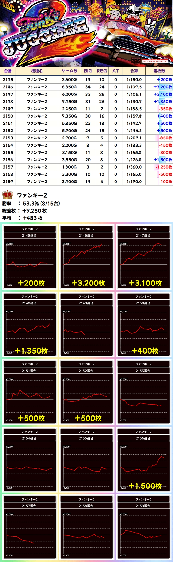 【1/2系濃厚】ファンキー2(8/15台+)→平均+483枚