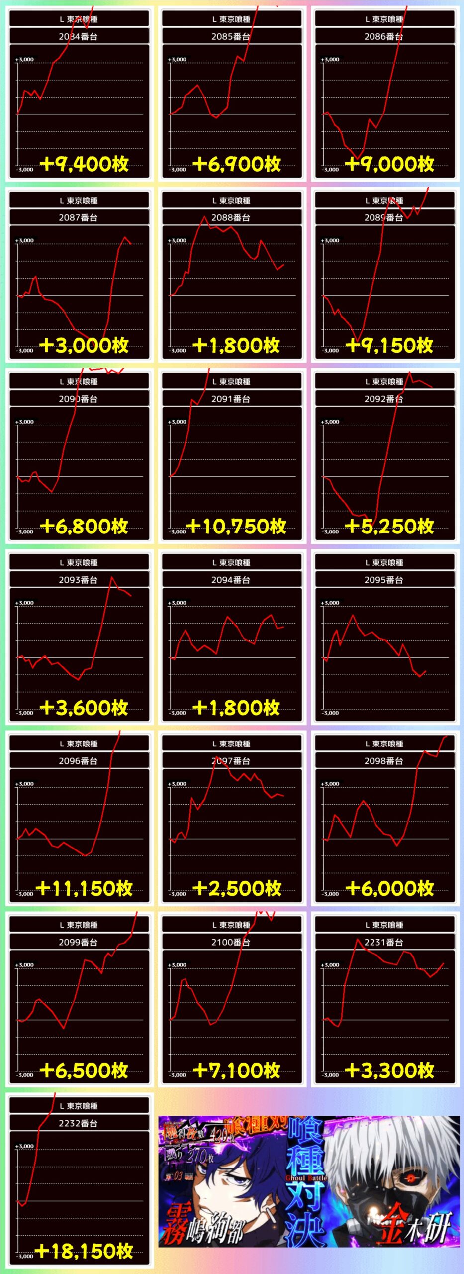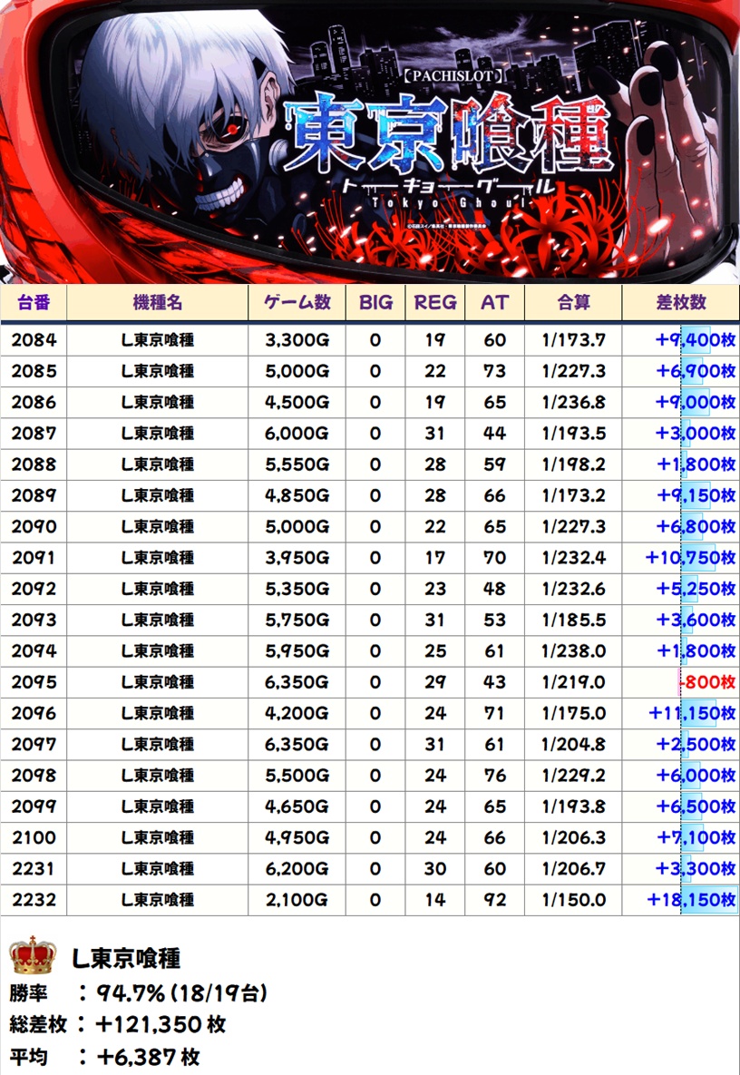 この日も前回と同じく東京喰種が全台系濃厚となっており、平均+6000枚オーバーと圧倒的な出玉を記録!