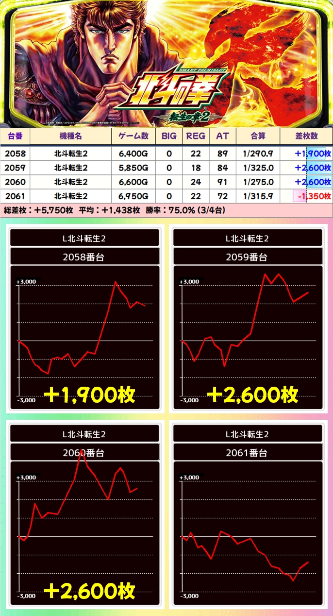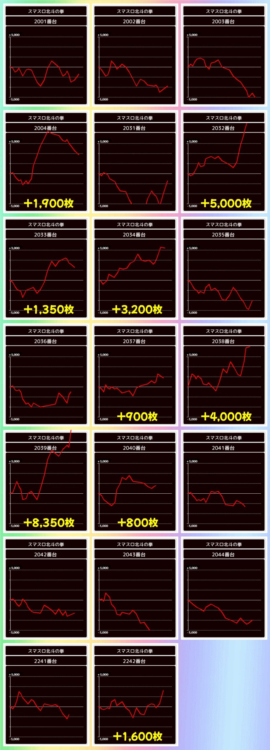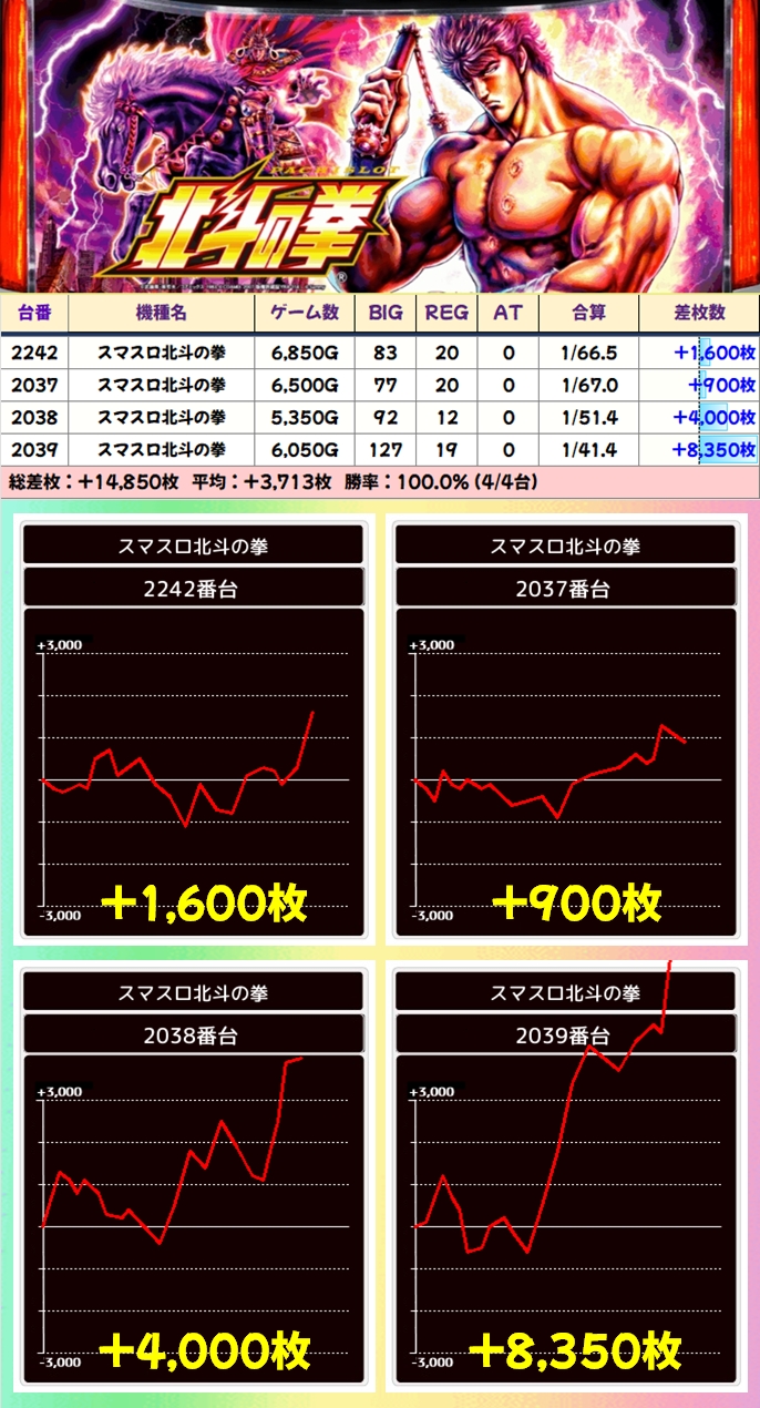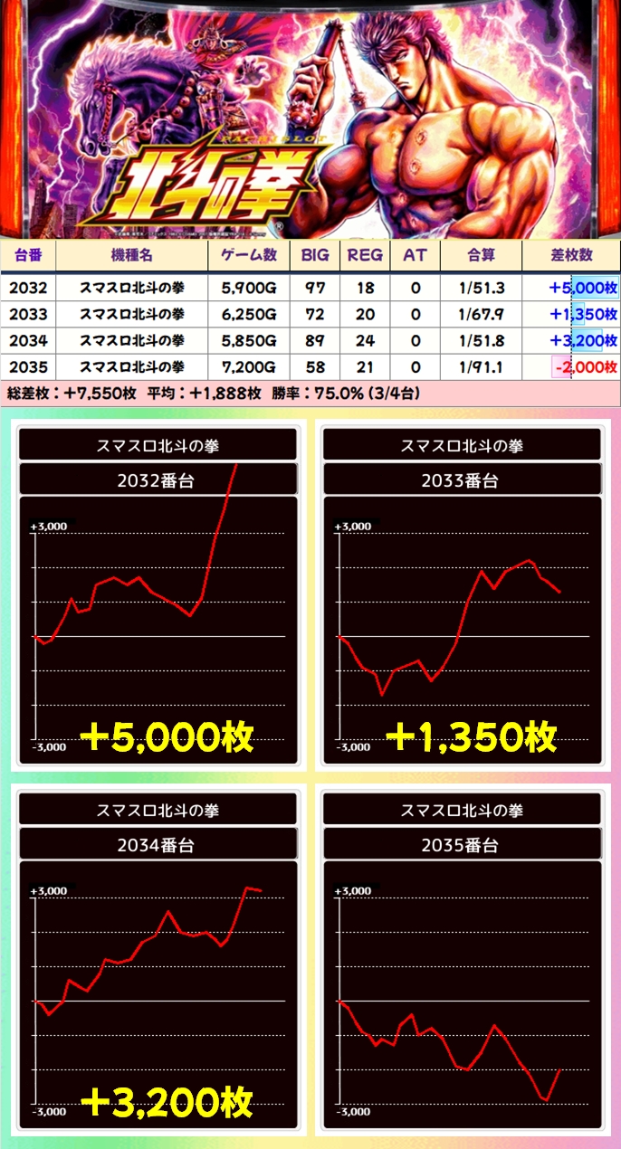 週間オススメとなっている初代北斗は1/2系の高配分だった模様で、+5000枚を筆頭に優秀台を多数確認!