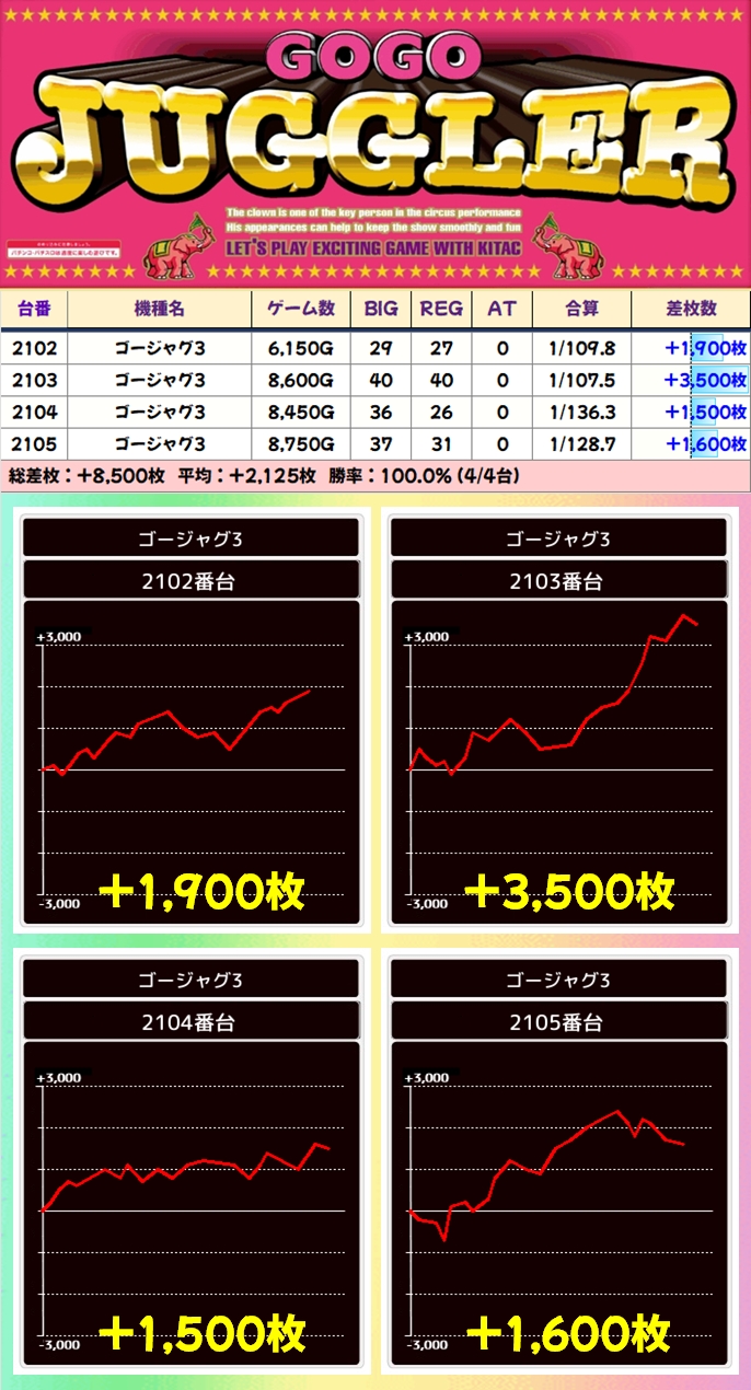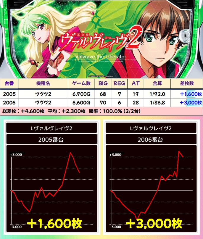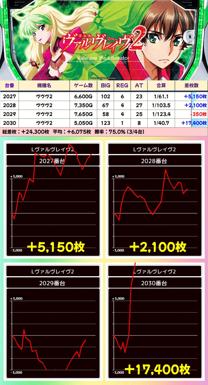 今回は来店取材が行われたということで、8台以上設置のヴァルヴレイヴ2とゴージャグ3が仕掛けの対象になっていたようで、ゴージャグ3も平均+1000枚超と好結果となっていました。