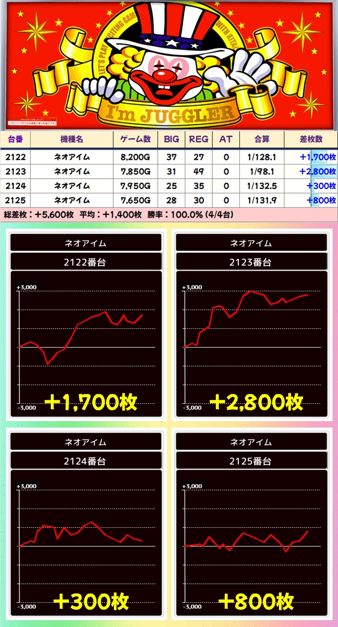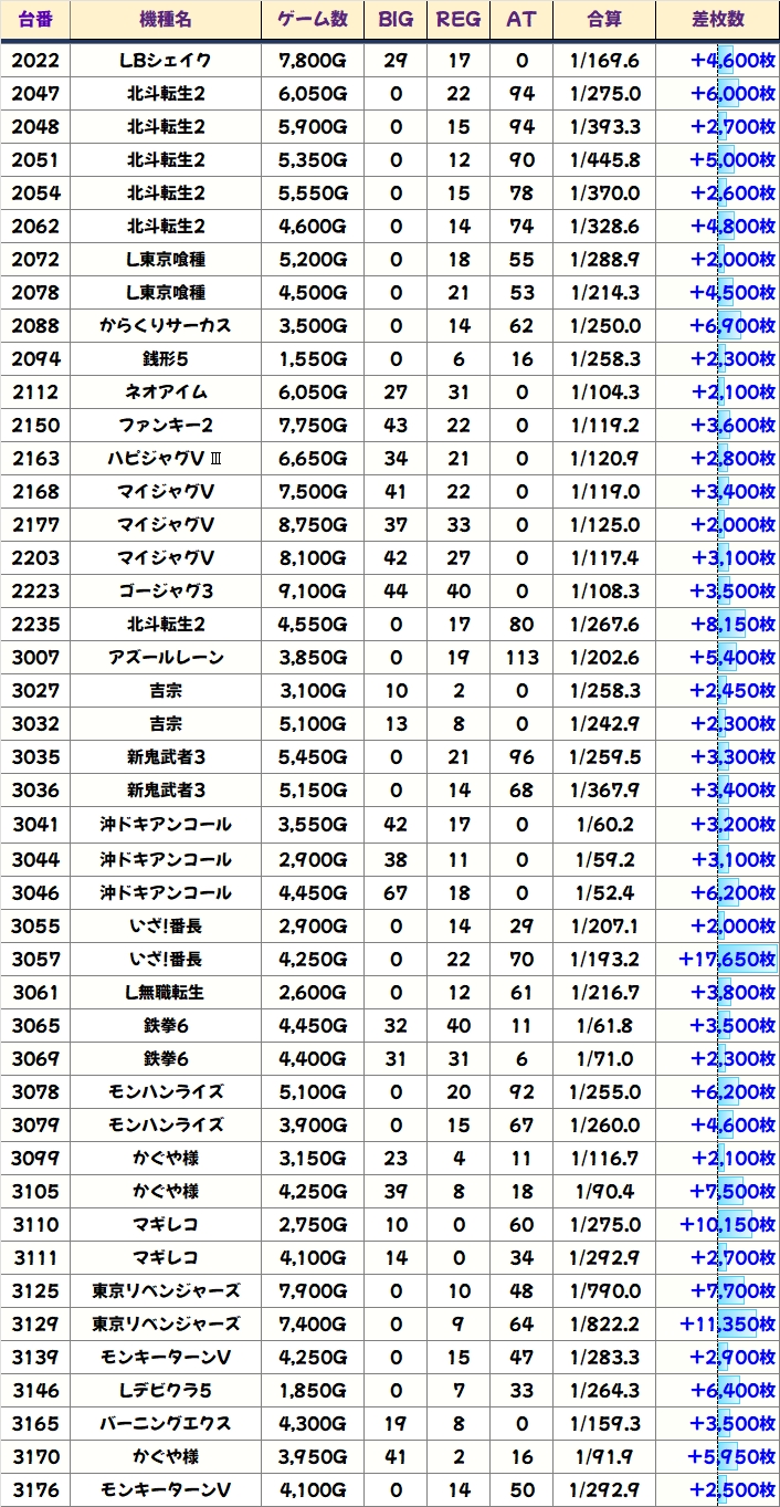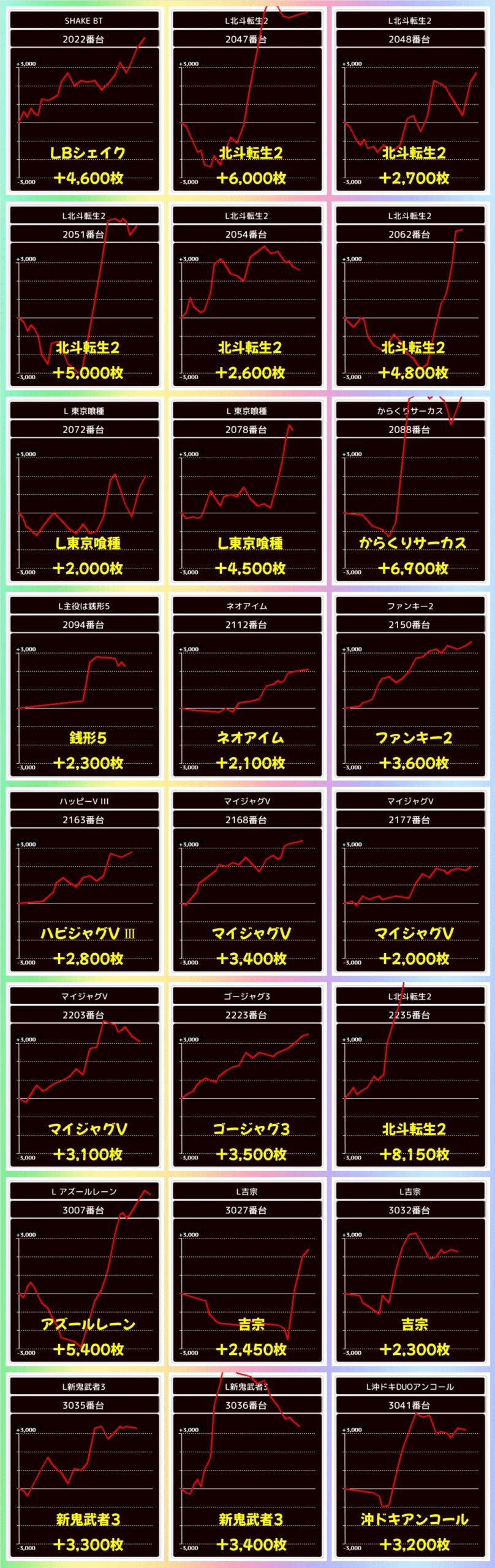 この日は渋谷ななこのポストで示唆されていた「シン」が全台当たりだったようで、その他のキャラからも優秀台を多数確認することができました。
