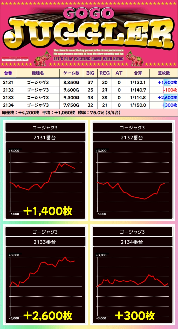 ウルトラミラジャグに関しては2台不発となっていますが、夜までブン回されているところを見ると、打ち手は当たりだと判断していたのかなと。
