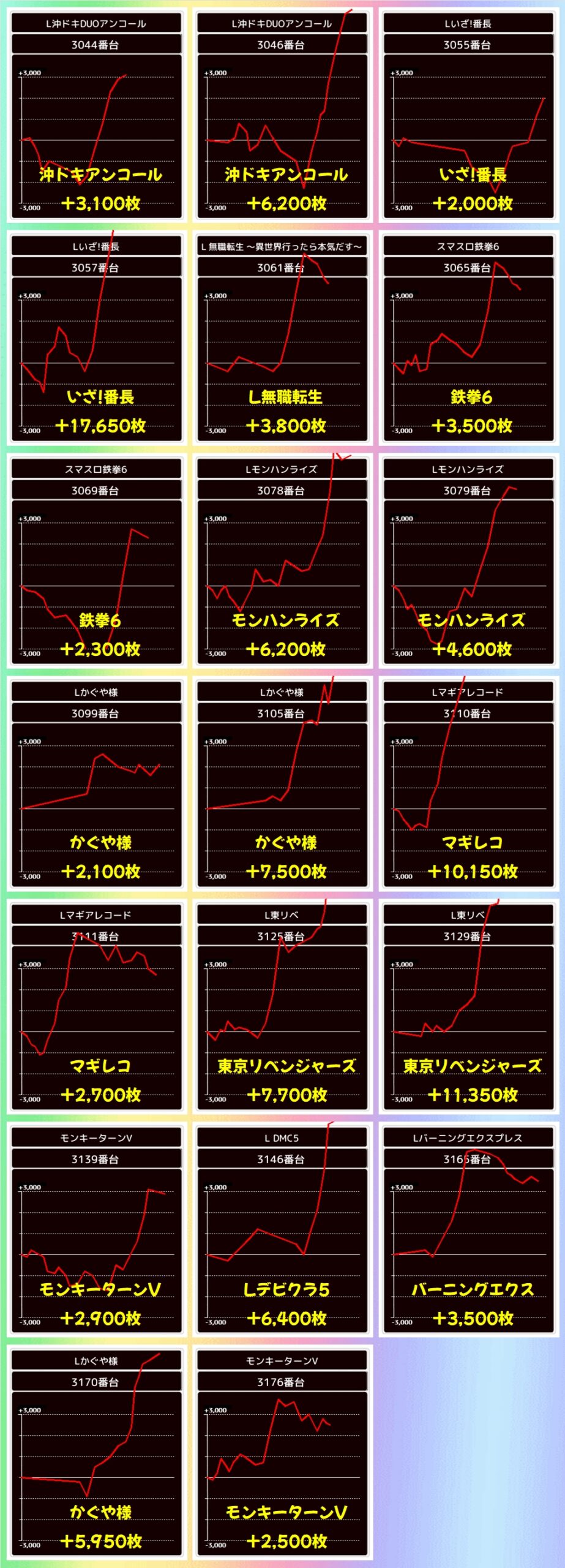 今回はななこポストからヒントを確認できた2機種が全台系の対象になっていたようで、とある超電磁砲2は平均+6000枚超と圧巻の出玉を記録!