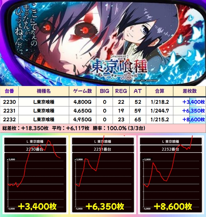 また、東京喰種からはポスター仕掛けの「霧島董香」で董香パネルが全台当たりとなっていたようです。