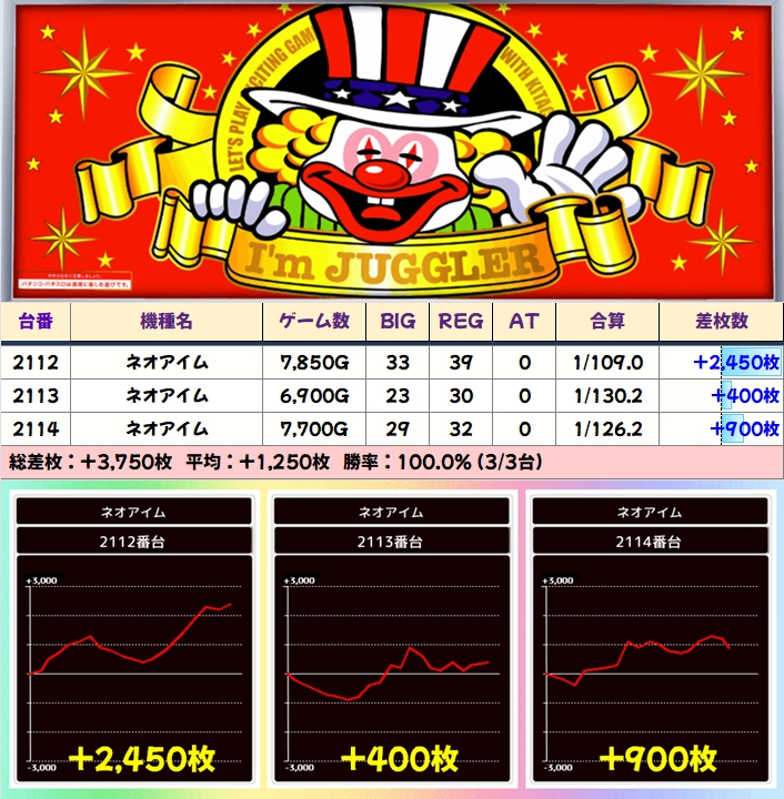 【3台並び】ネオアイム(2112-2114番台)→平均1,250枚(3/3台+)