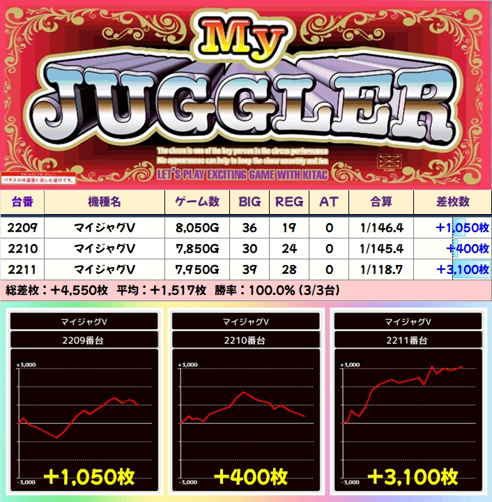 【3台並び】マイジャグV(2209-2211番台)→平均1,517枚(3/3台+)