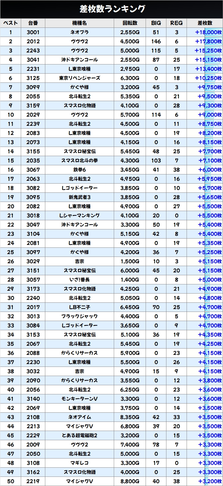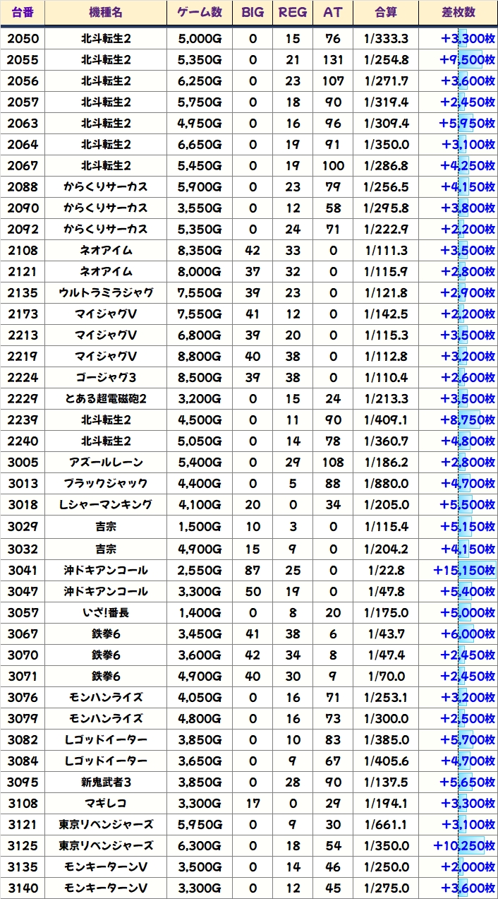 そんな、毎月1日の近隣対抗日でしたが、今回もお宝台が多数投入されていたようで、ホール全体でしっかりプラス差枚を記録!