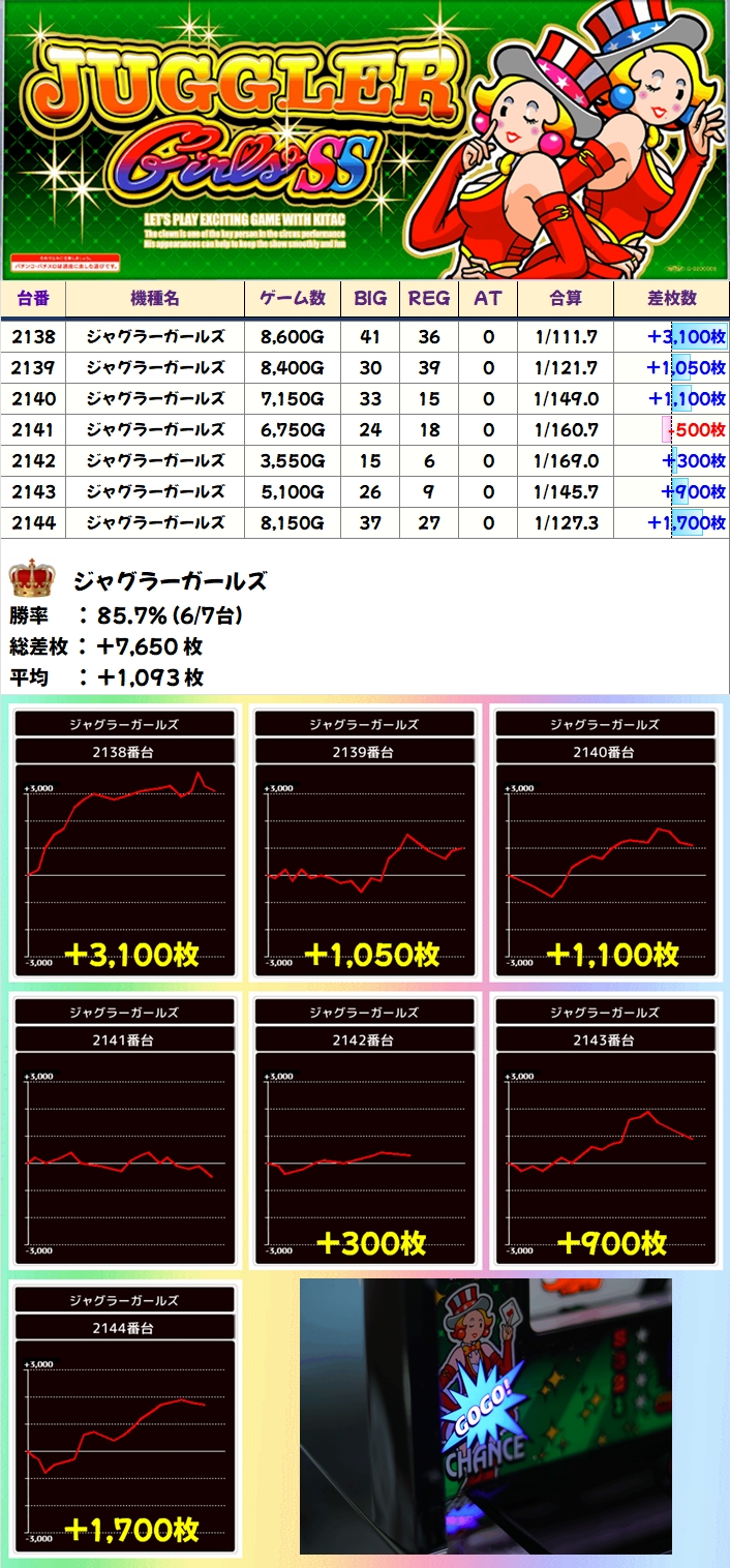 【全台系濃厚】ジャグラーガールズ(6/7台+)→平均+1,093枚