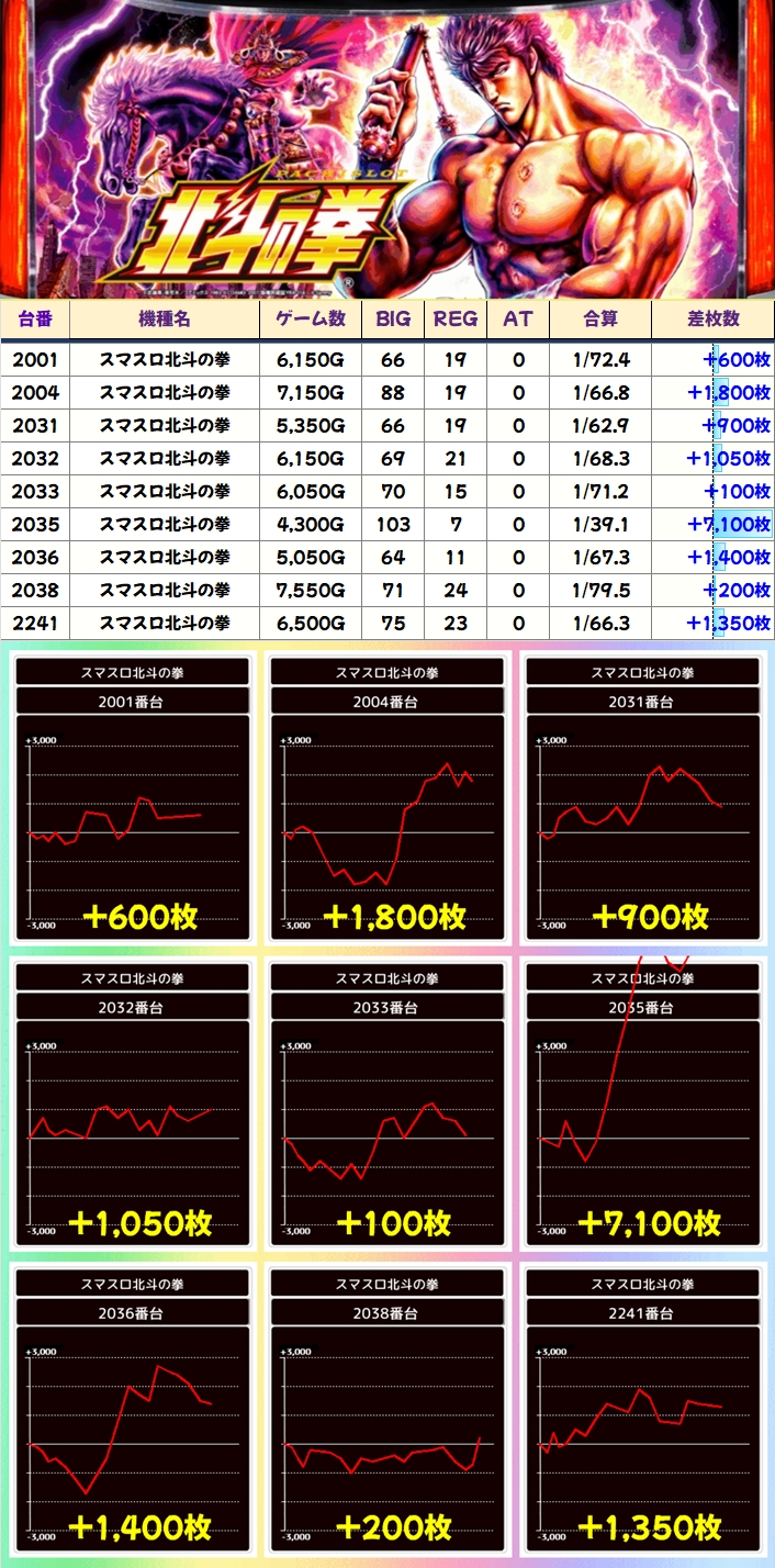 この日は多台数設置の北斗転生2から優秀台を多数確認でき、+9000枚オーバーの万枚クラスの台も出現!