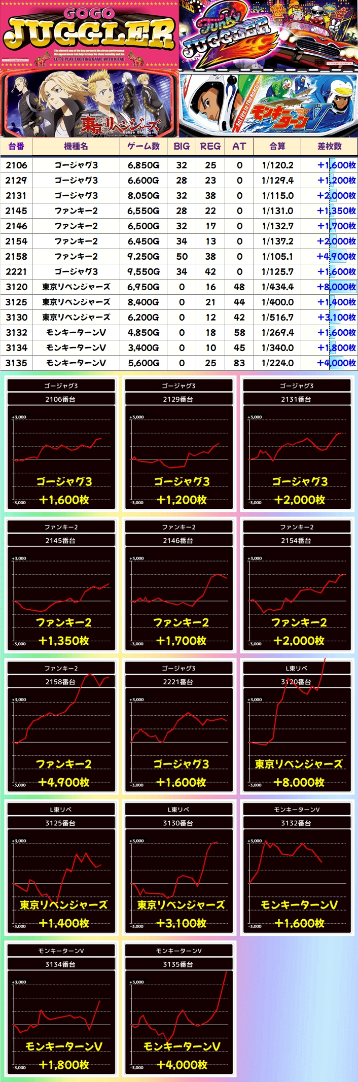 今回はオススメ機種のジャグラーシリーズと東京喰種から並び仕掛けを確認でき、東京喰種からは平均+5000枚オーバーに加えて平均+8000枚オーバーの2台並びが出現!!