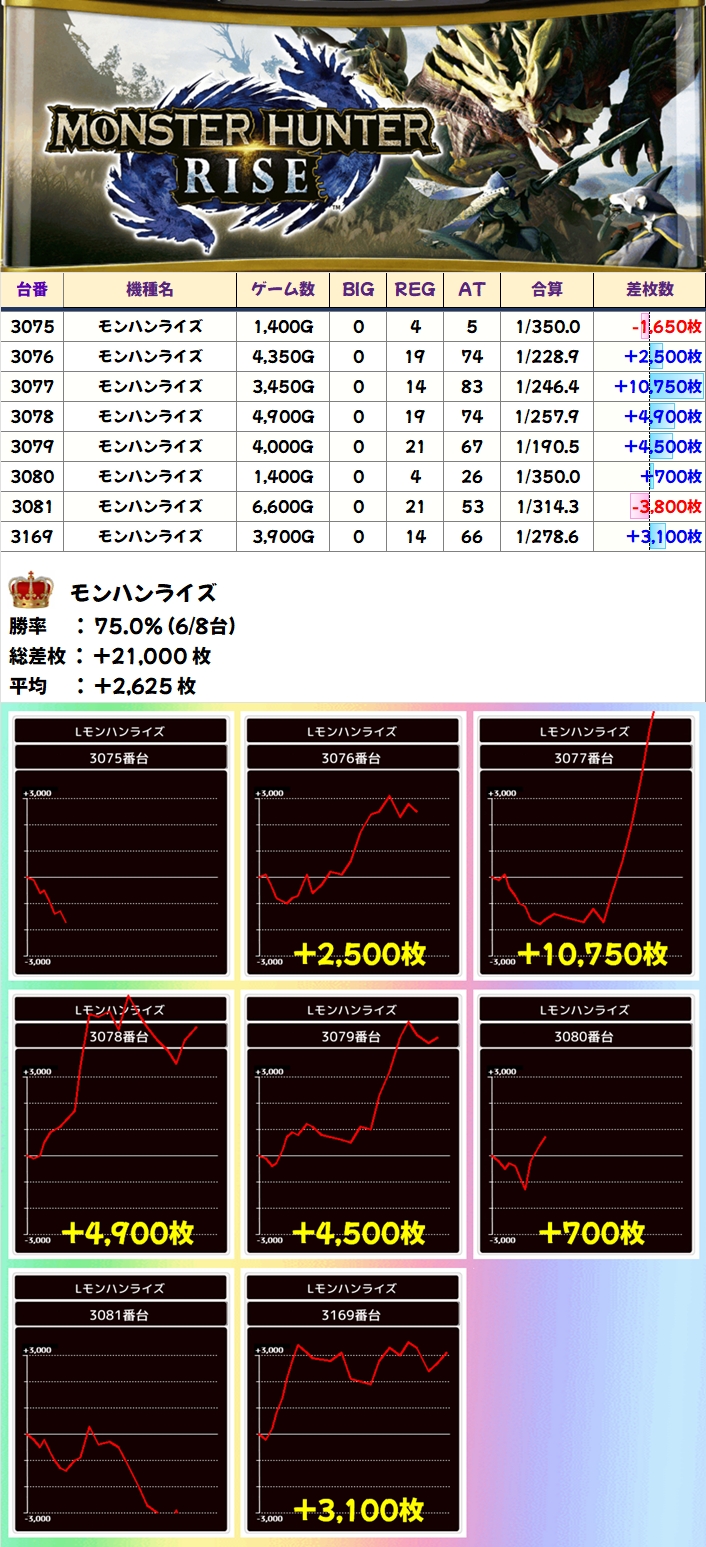 【1/2系濃厚】モンハンライズ(6/8台+)→平均+2,625枚