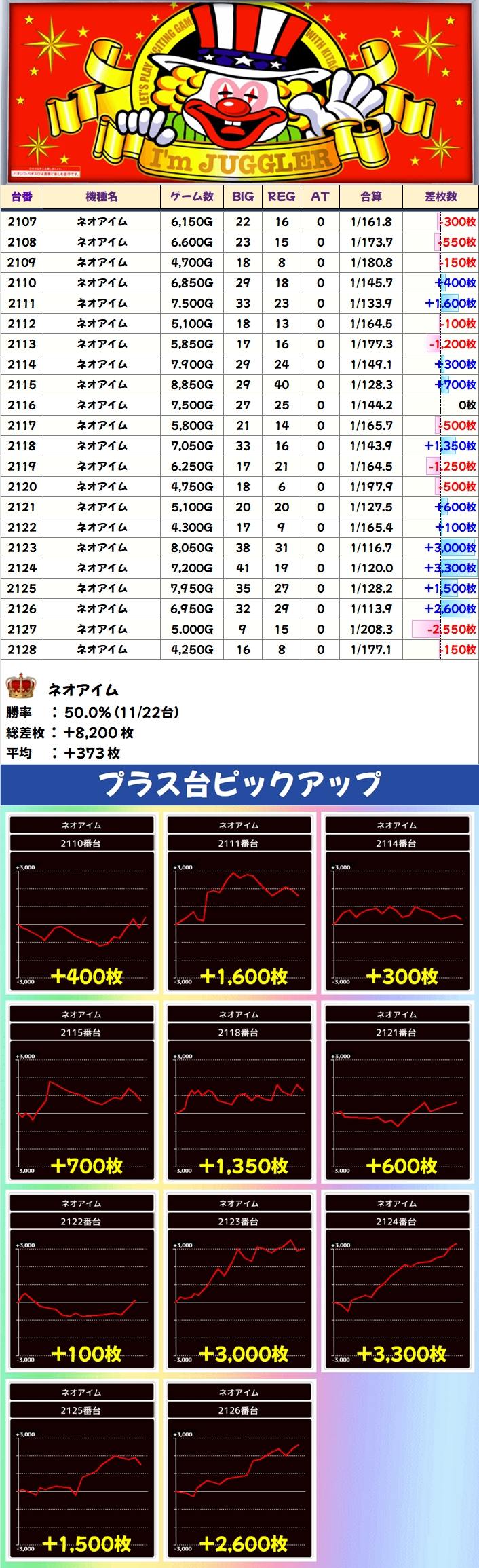 【1/2系濃厚】ネオアイム(11/22台+)→平均+373枚