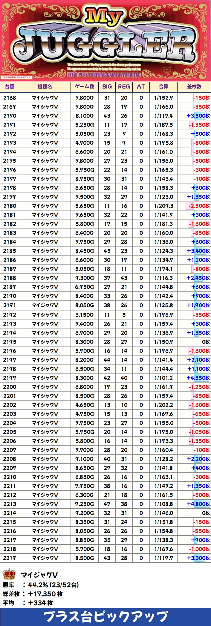 【高配分】マイジャグV(23/52台+)→平均+334枚