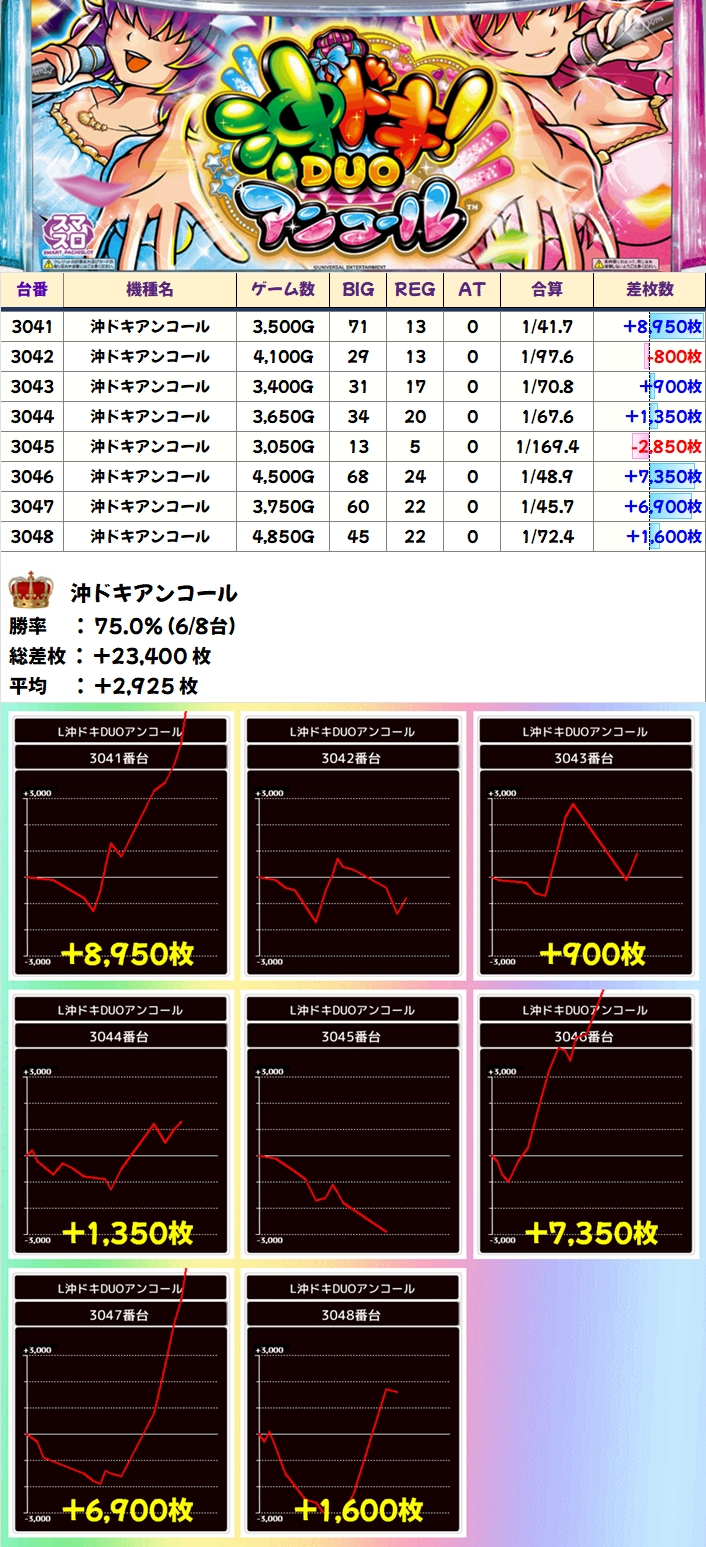 【1/2系濃厚】沖ドキアンコール(6/8台+)→平均+2,925枚