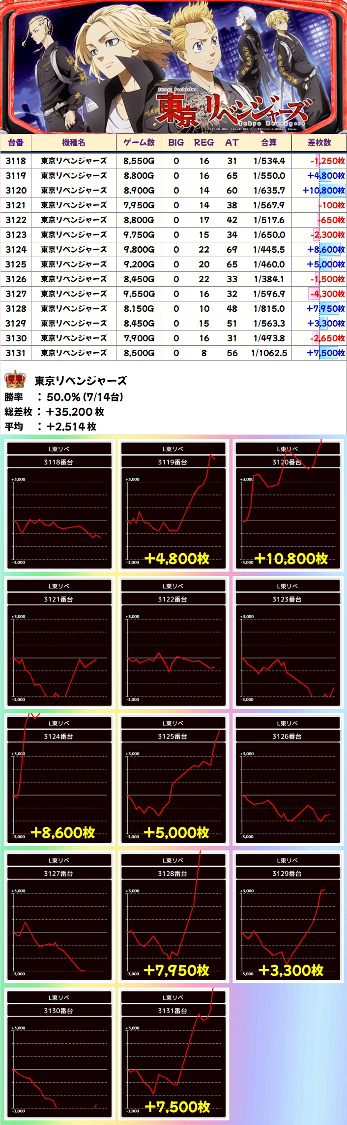 【1/2系濃厚】東京リベンジャーズ(7/14台+)→平均+2,514枚