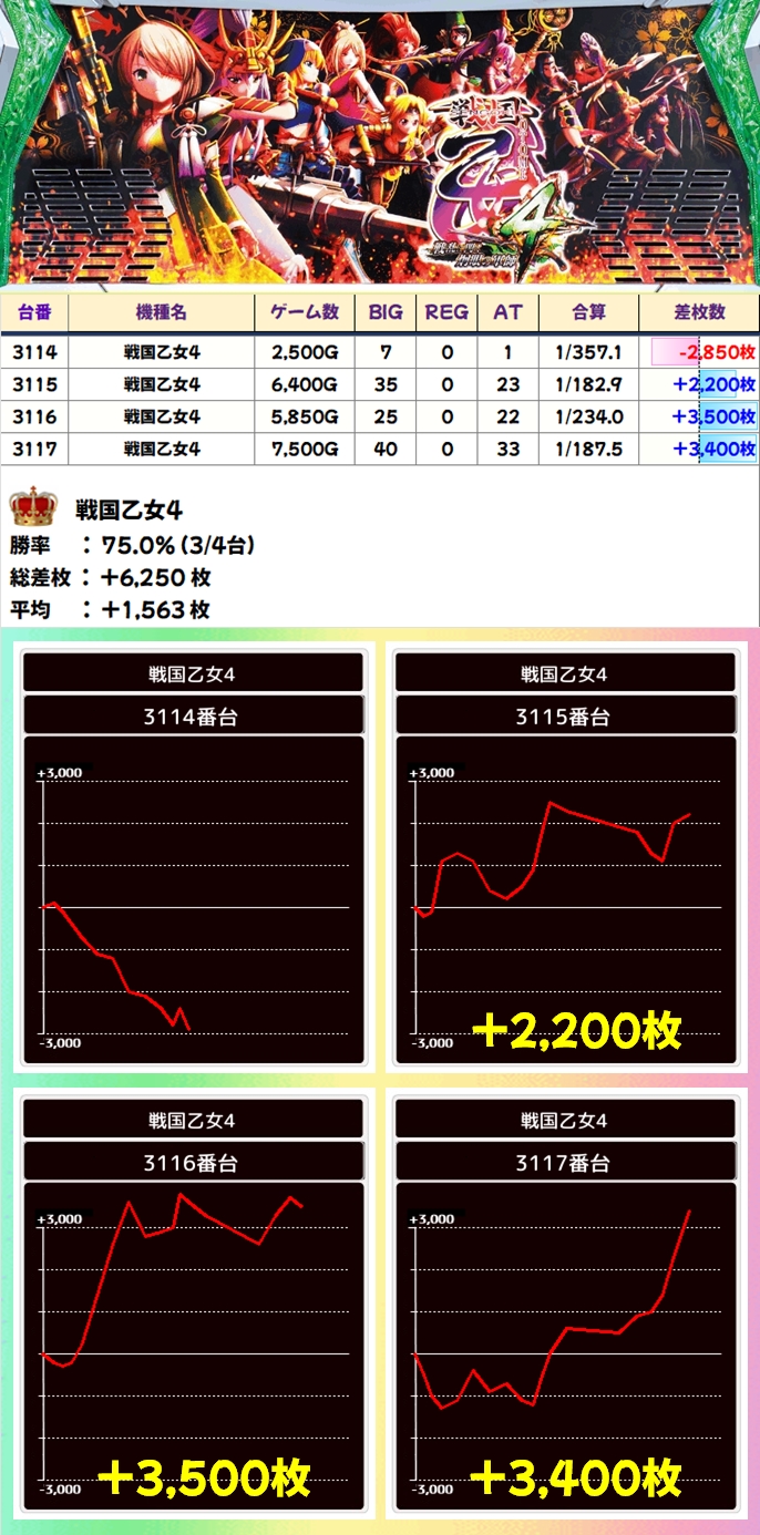 【1/2系濃厚】戦国乙女4(3/4台+)→平均+1,563枚