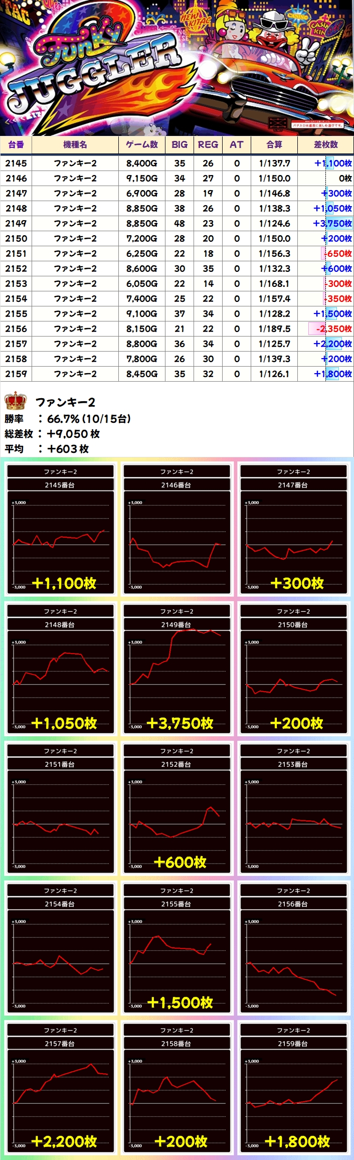 【1/2系濃厚】ファンキー2(10/15台+)→平均+603枚
