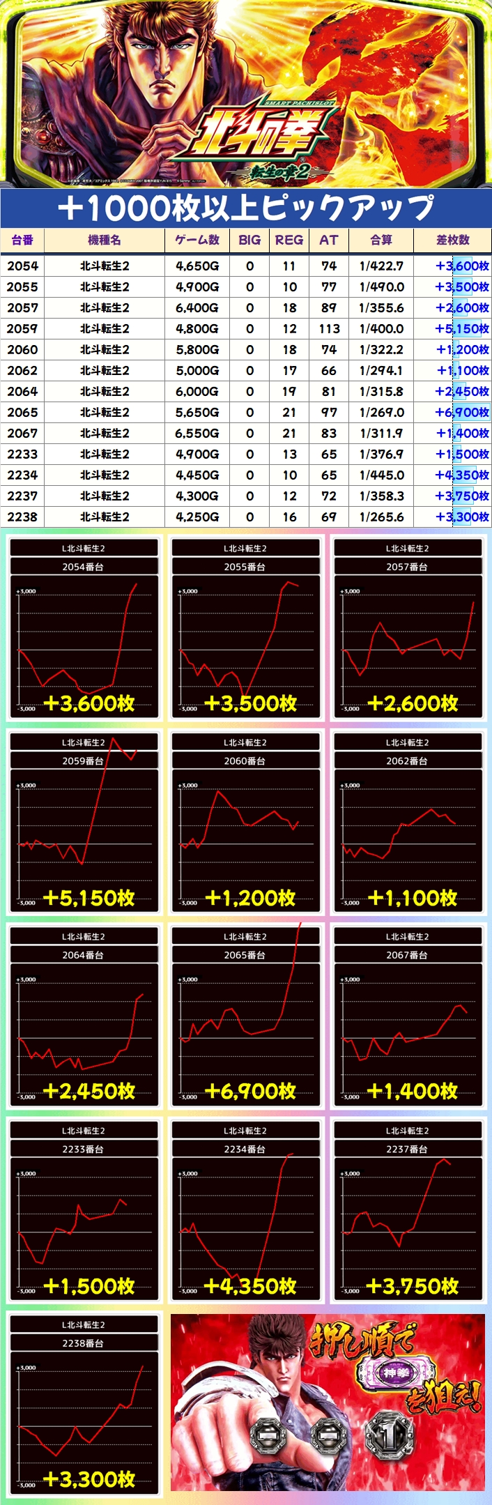 北斗転生2に関しては週間オススメ機種となっており、+1000枚以上の優秀台を多数確認することができました。