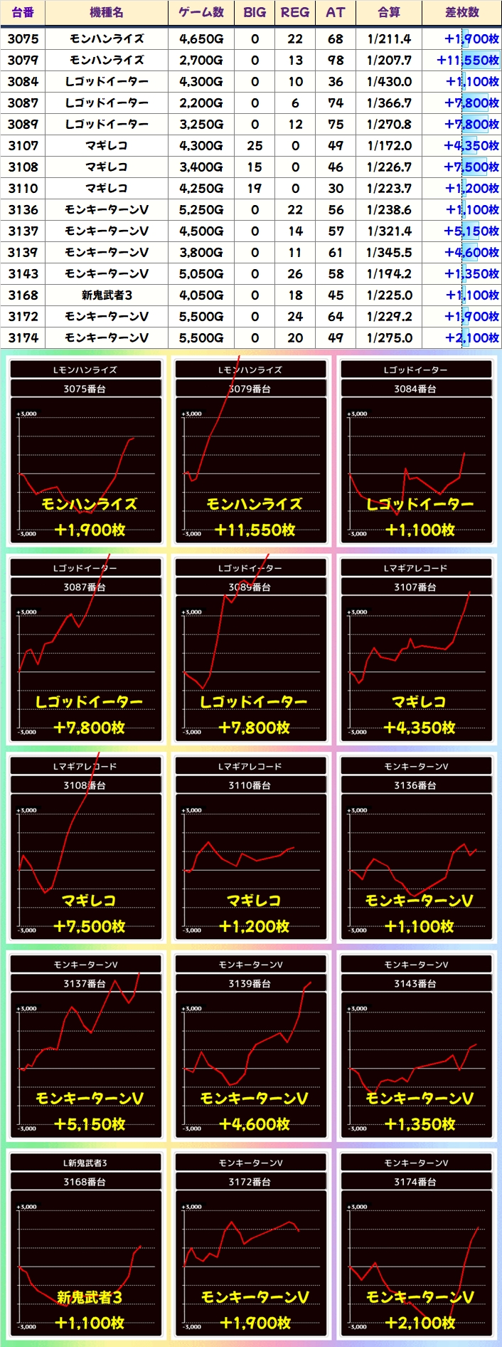 上記の機種の中からは大量出玉も多数出現しており、モンハンライズからは万枚オーバー台が出現していました。