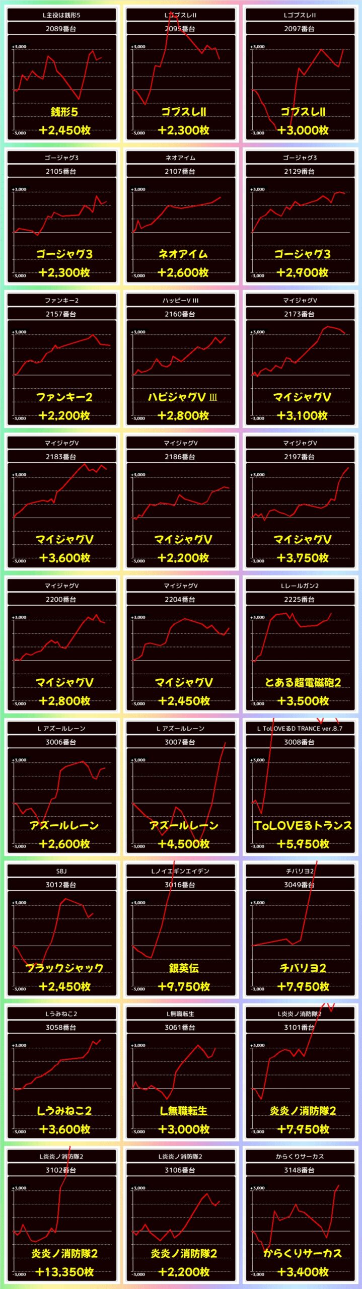 バジ絆2天膳と刃牙に関しては渋谷ななこのポストで示唆された機種となっており、バジ絆2天膳からは+16250枚の爆出し台を筆頭に4台とも大量出玉を記録! バジ絆2天膳は機種全体でも平均+11,313枚と万枚オーバーと圧巻の出玉となっており、仕掛けの質も高かったようです。