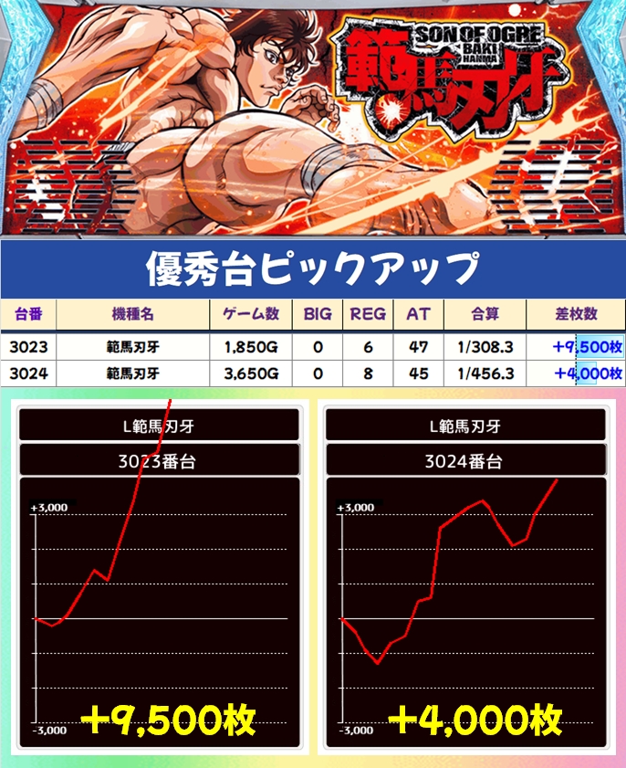 さらに、冒頭で紹介したななこポストの示唆機種も多く含まれており、新台の範馬刃牙も仕掛けの対象になっていました。