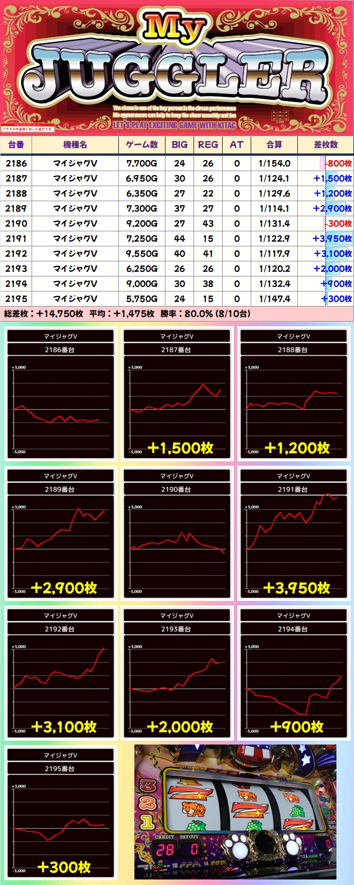 【列仕掛け】マイジャグV(2186台番〜2195台番)→平均+1,475枚(8/10台+)