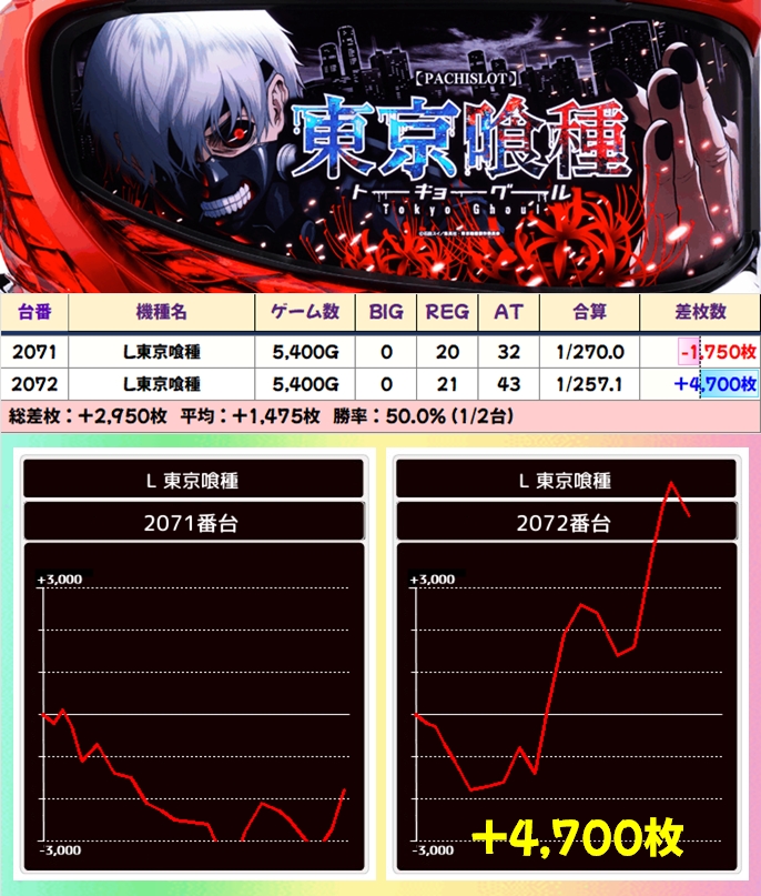 【2台並び】L東京喰種(2071台番〜2072台番)→平均+1,475枚(1/2台+)