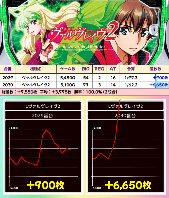 【2台並び】ヴァルヴレイヴ2(2029台番〜2030台番)→平均+3,775枚(2/2台+)