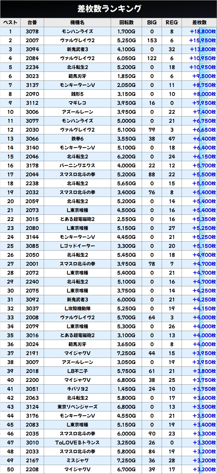 上記の機種の中からは大量出玉も確認でき、ヴァルヴレイヴ2とモンハンライズからは万枚オーバー台が出現!