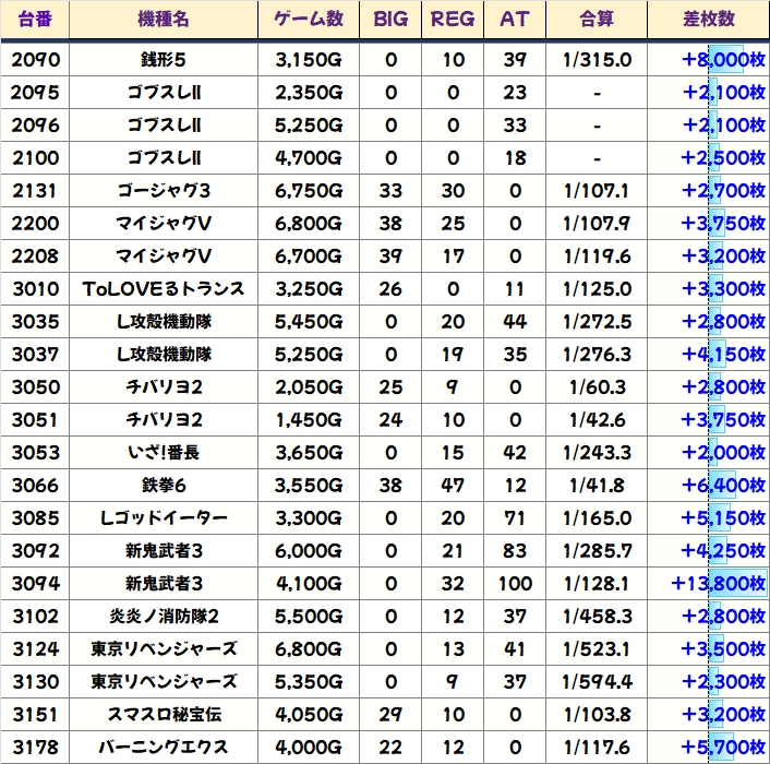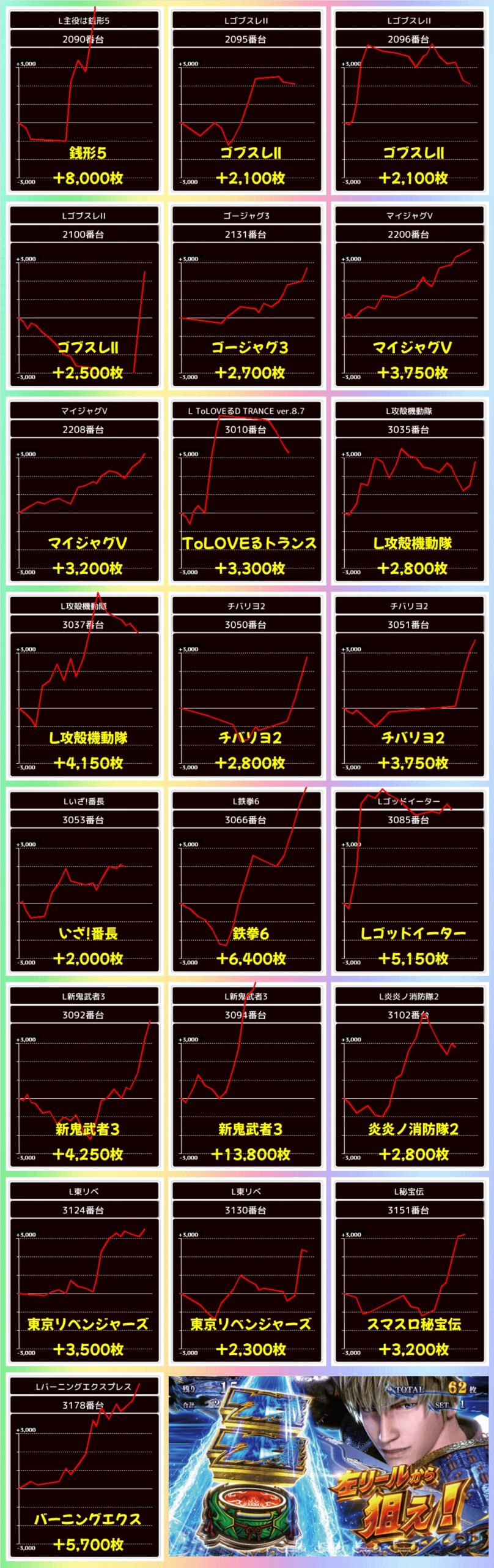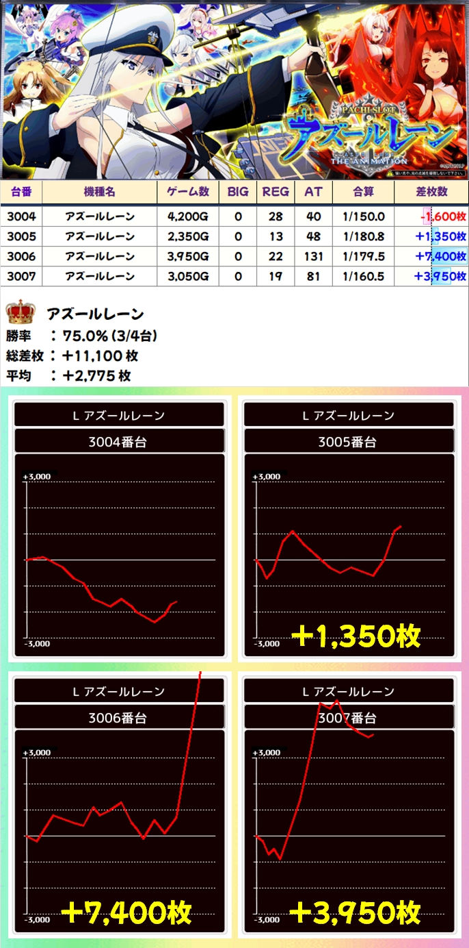 今回は4台設置のアズールレーンと3台設置のミスジャグが全台系濃厚となっており、マイナス台もしっかり粘られていました。