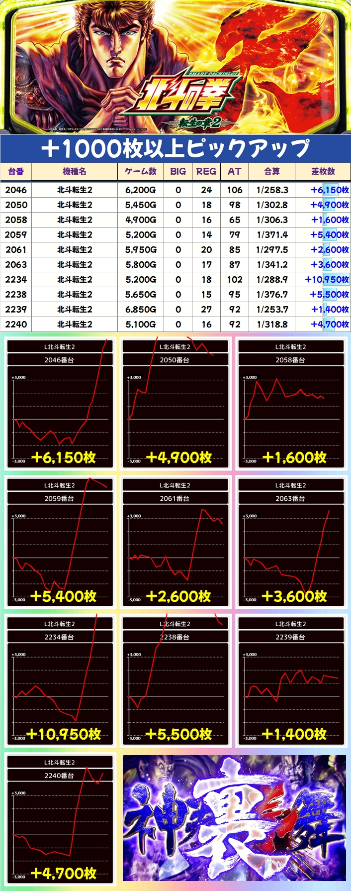 スマスロ北斗はデータランプのキャラごとにお宝台が毎日投入されており、この日は「ケンシロウ」が全台当たりだった模様!