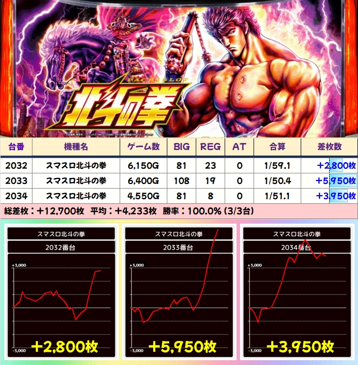 【3台並び】スマスロ北斗の拳(2032番台〜2034番台)→平均+4,233枚(3/3台+)