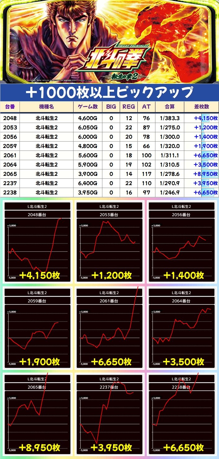 【3台並び】北斗転生2(2236番台〜2238番台)→平均+2,867枚(2/3台+)
