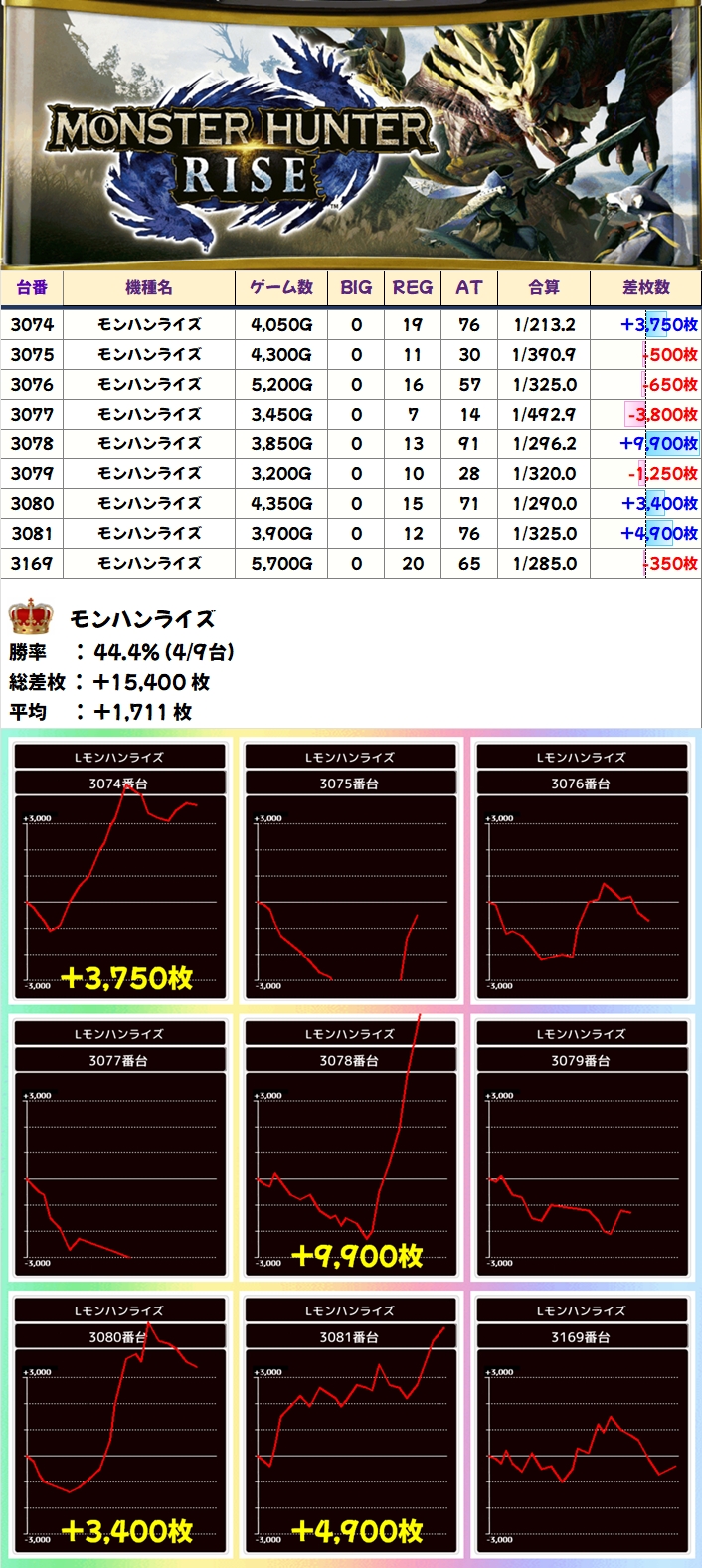 【1/2系濃厚】モンハンライズ(4/9台+)→平均+1,711枚
