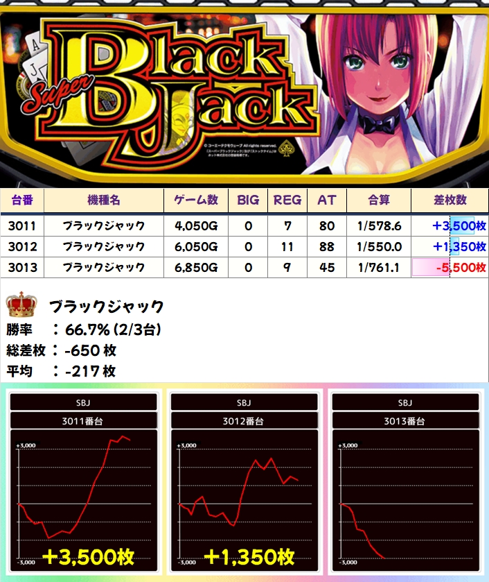 なお、この日は上記の7機種以外にも全台系が用意されていたようで、出玉こそ不発に終わっているもののスーパーブラックジャックも全台系と思しき稼働になっていました。