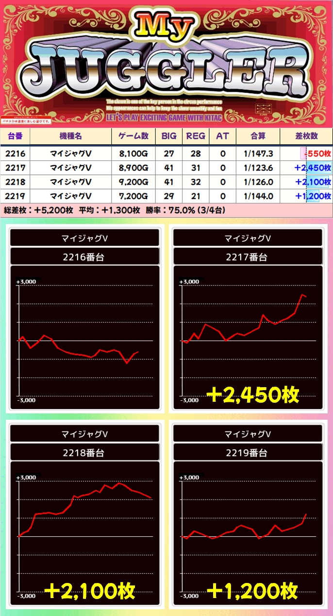 【列仕掛け】マイジャグV(2216台番〜2219台番)→平均+1,300枚(3/4台+)