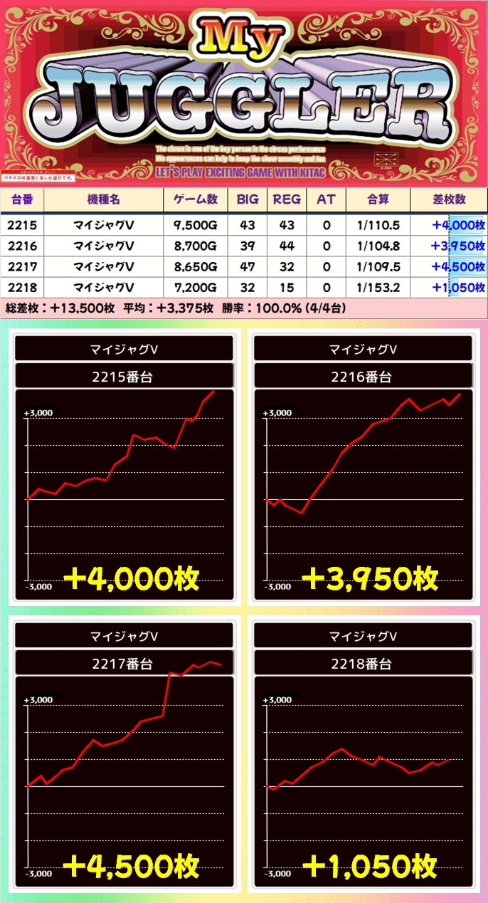 【4台並び】マイジャグV(2215番台〜2218番台)→平均+3,375枚(4/4台+)