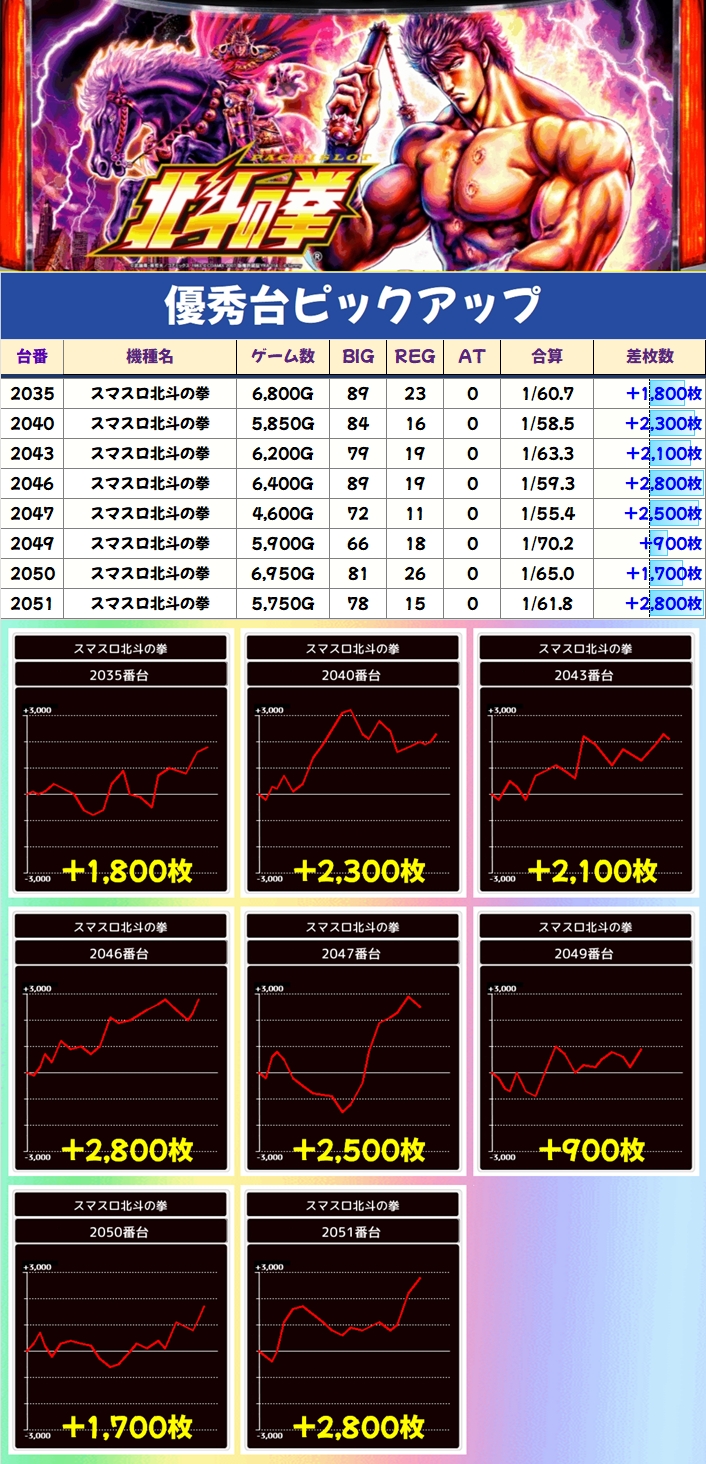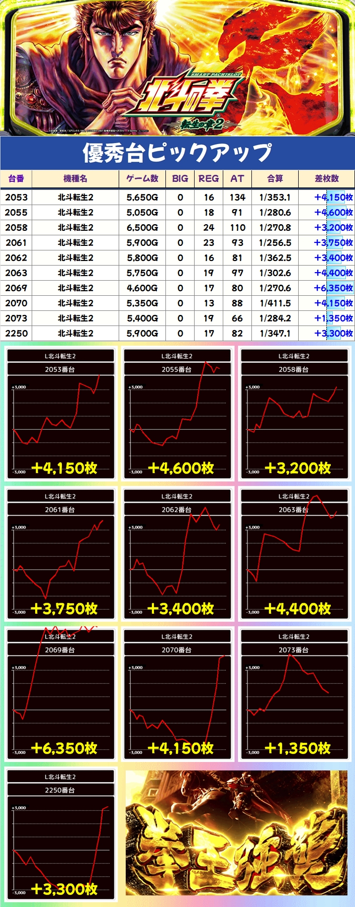 北斗シリーズは日を問わずお宝台の投入に期待でき、この日も両機種から優秀台多数確認することができました。