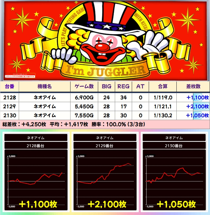 【3台並び】ネオアイム(2128台番〜2130台番)→平均+1,417枚(3/3台+)