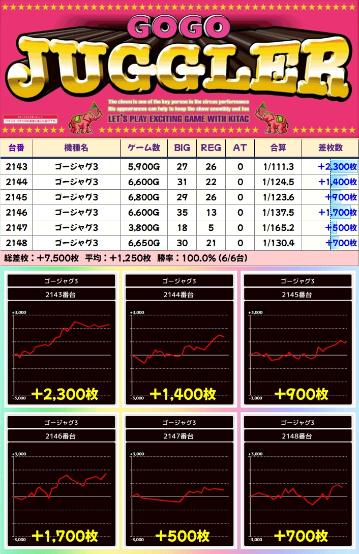 【6台並び】ゴージャグ3(2143台番〜2148台番)→平均+1,250枚(6/6台+)