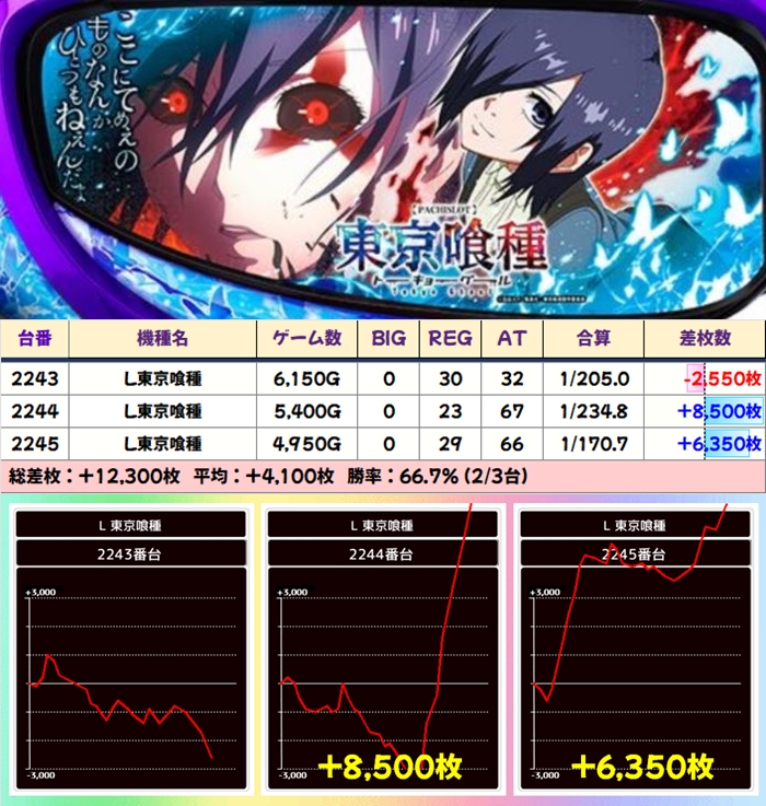 【3台並び】L東京喰種・董香パネル全台(2243台番〜2245台番)→平均+4,100枚(2/3台+)